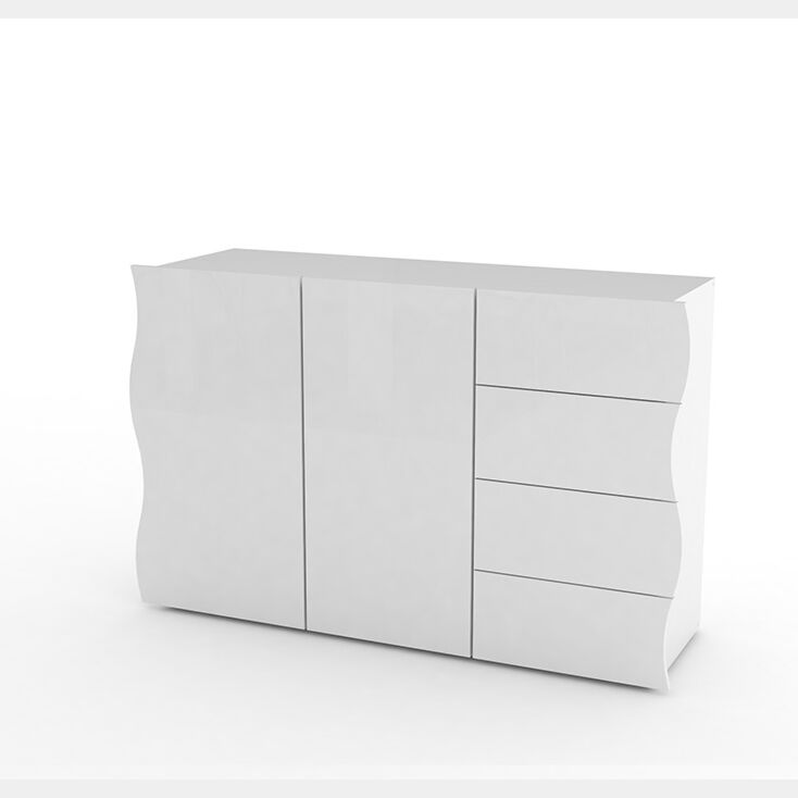 Il prodotto è una madia / comò di design moderno e funzionale adatto sia in soggiorno che in camera da letto. Questa sua doppia funzione è possibile grazie al grande spazio al suo interno, infatti la madia è composta da 2 ante battenti sagomate e 4 cassetti sagomati, tutto nella finitura bianco laccato lucido.