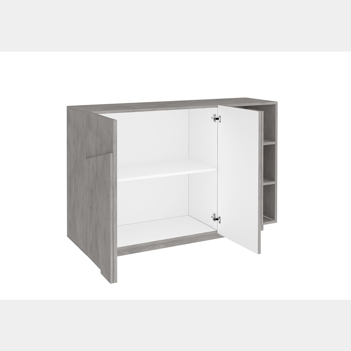 La madia moderna in finitura beton presenta due ante con disegni geometrici e 2 ripiani esterni.