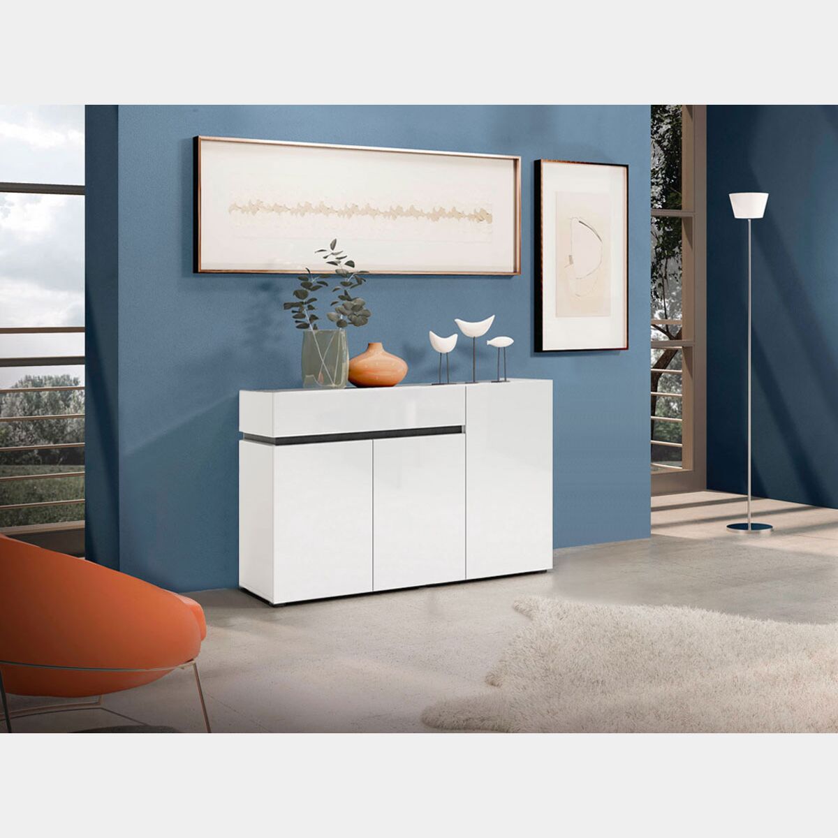 Madia con maniglia a gola, 3 ante 1 cassetto, finitura Bianco laccato lucido