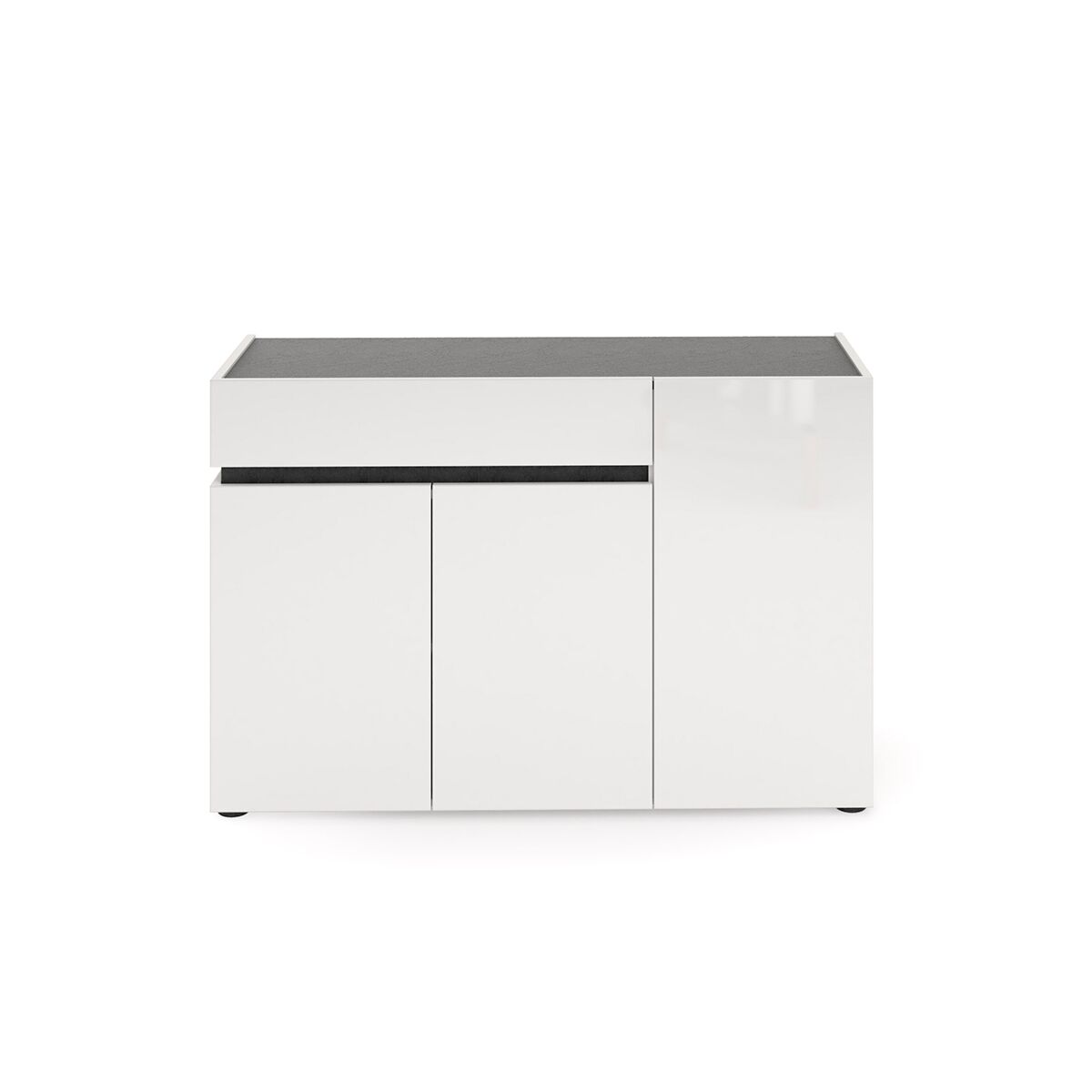 La credenza è composta da tre ante battenti con ripiano centale e da un piccolo cassetto superiore. Questa suddivisione interna dello spazio assicura un'ampia capienza per tutti gli oggetti. Tutte i frontali sono dotati di chisura rallentata, per preservare l'integrità del mobile nel tempo.