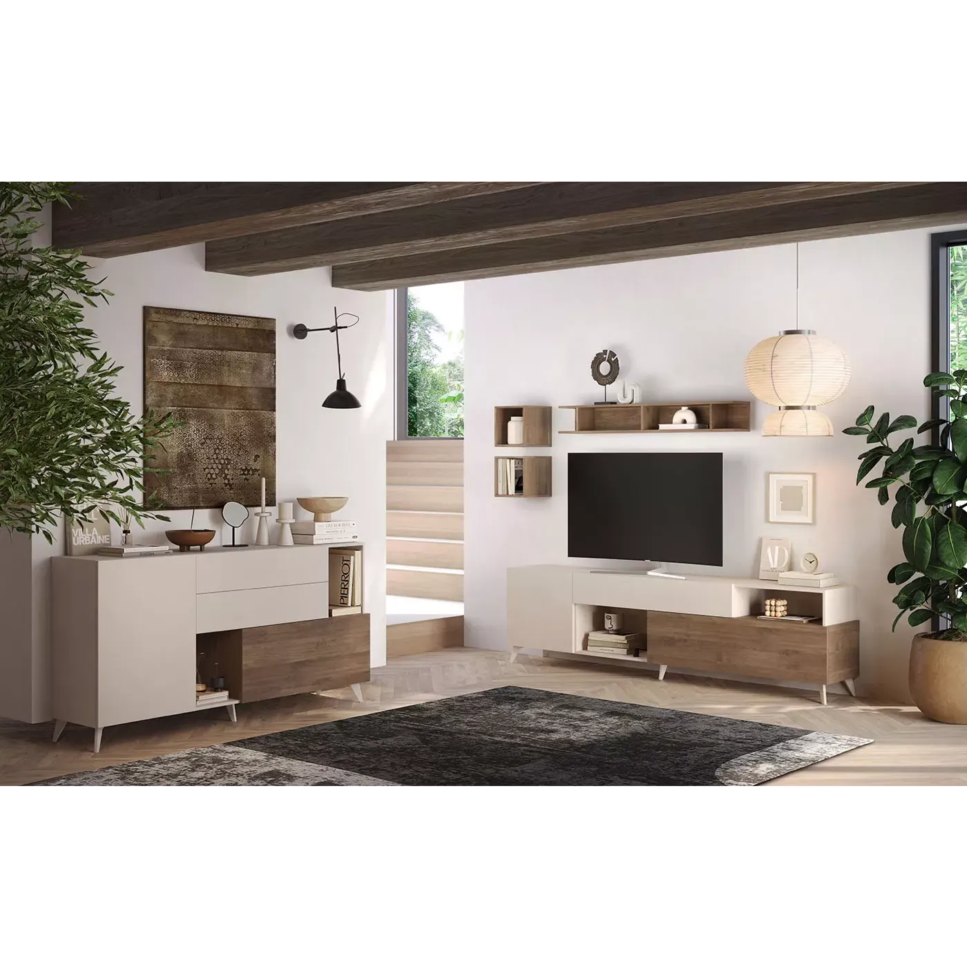 La delicata finitura Cashmere viene accompagnata da una tinta legno, il Mercure, che mette in evidenza l'anta a ribalta. I pratici piedini a cono, che ben si accostano alla struttura, le conferiscono uno stile moderno ed elegante.