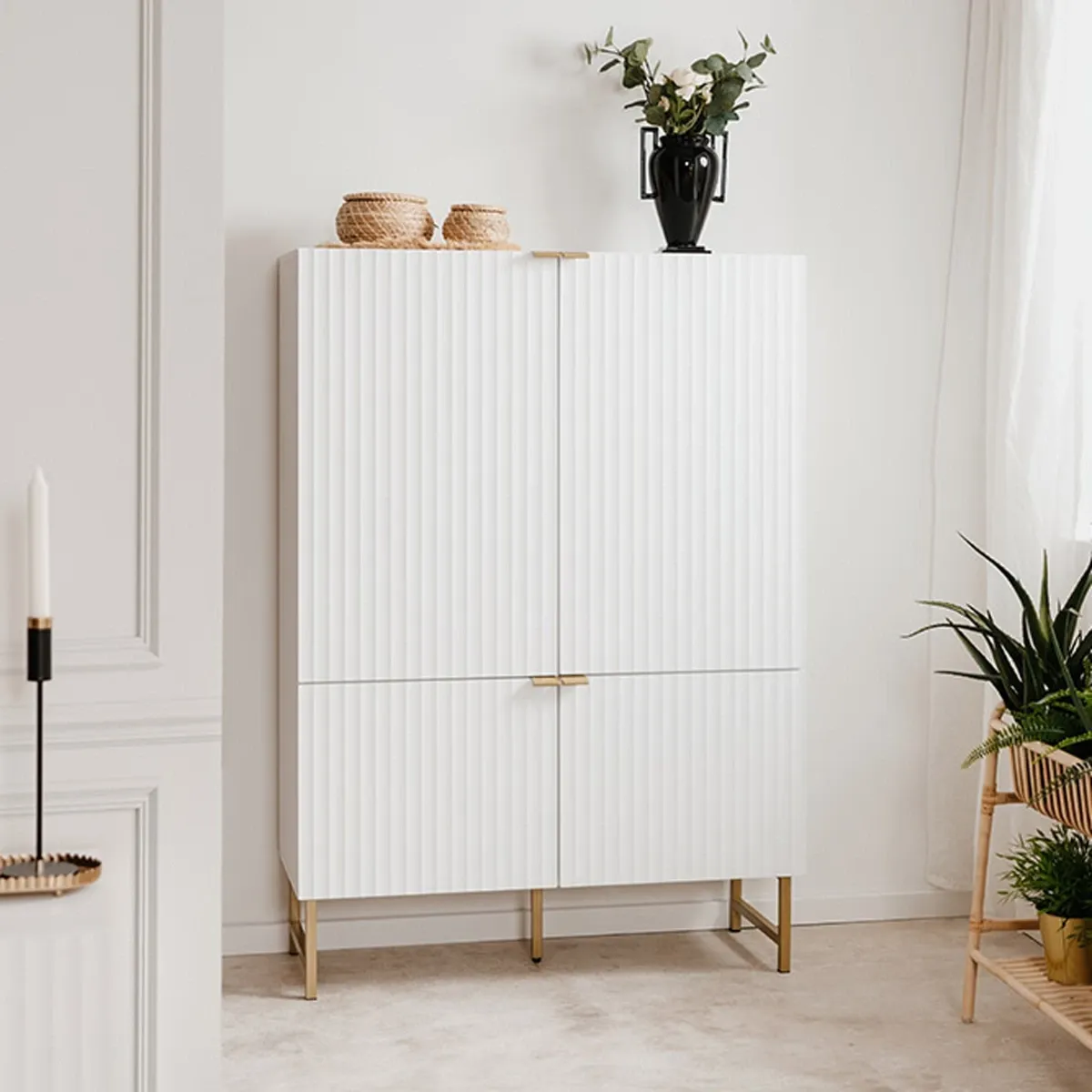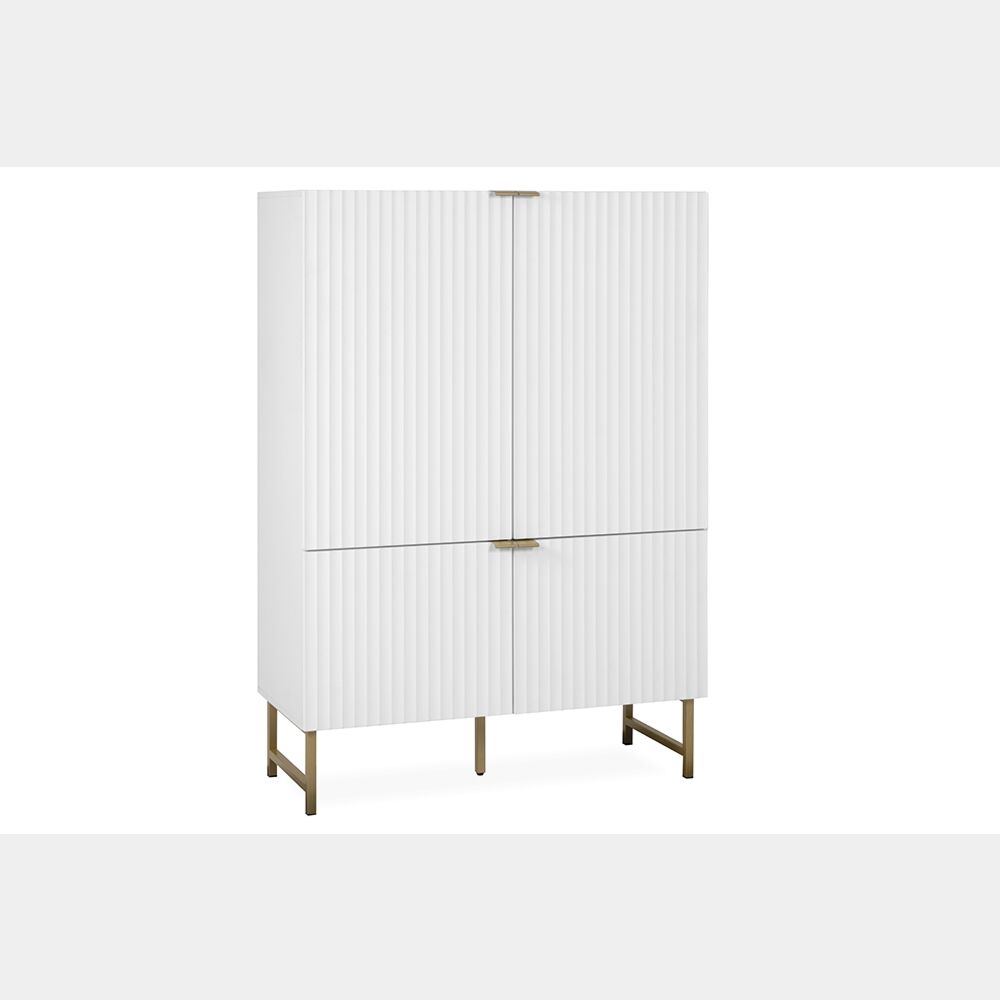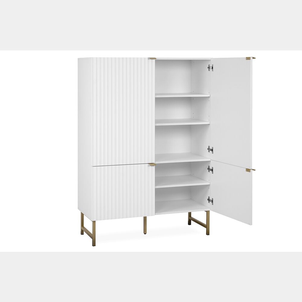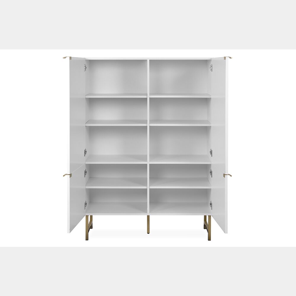 Madia contenitore alta moderna 2 ante, 4 ripiani interni per ogni anta, la credenza presenta un design semplice ma di impatto. Grazie infatti alla sua delicata finitura in bianco opaco e le maniglie e i piedini dorati dona luce e rende accogliente l'ambiente.