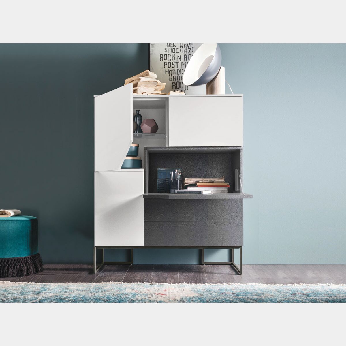 La madia presenta un design accattivante: il contrasto tra le due finiture bianco gesso e cemento scuro ed il basamento antracite opaco assicura un grande impatto, assicurando così alla madia il ruolo da protagonista del living. Estetica e praticità vengono coniugate in un solo complemento d'arredo per offrire un mobile capace di personalizzare la sala da pranzo offrendo al contempo tutta la praticità necessaria nel quotidiano.