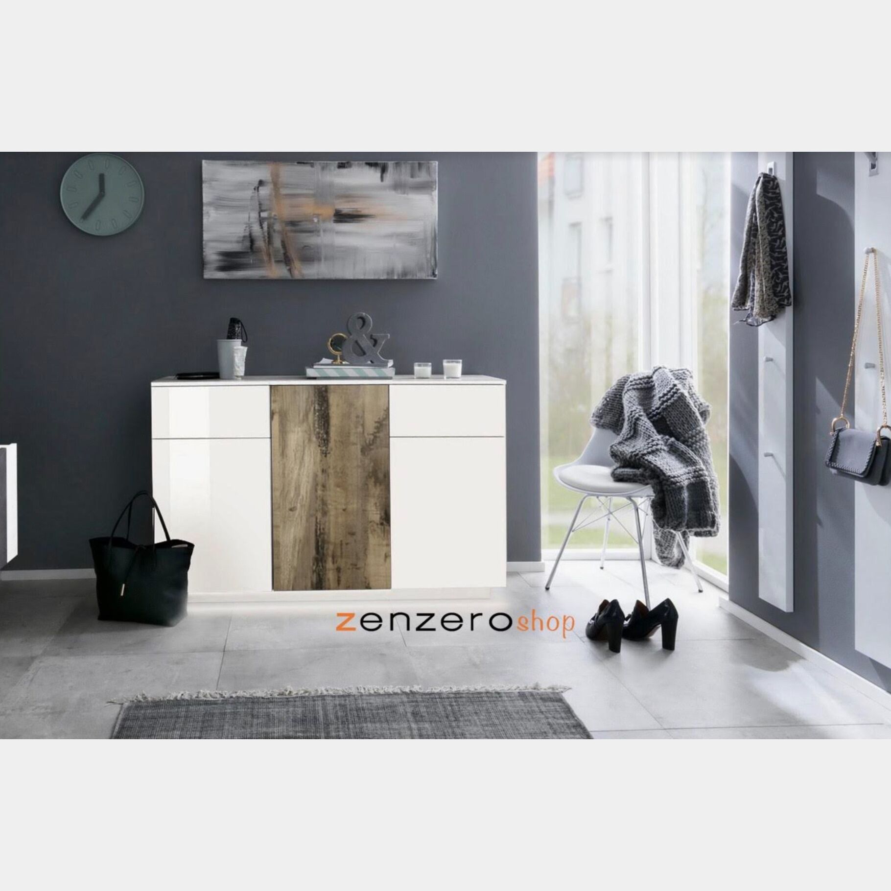 Madia Bianco lucido e Pero linee sobrie e moderne, la rendono un mobile che trasmette semplicità e calore, sarà perfetta in qualsiasi stanza della casa.