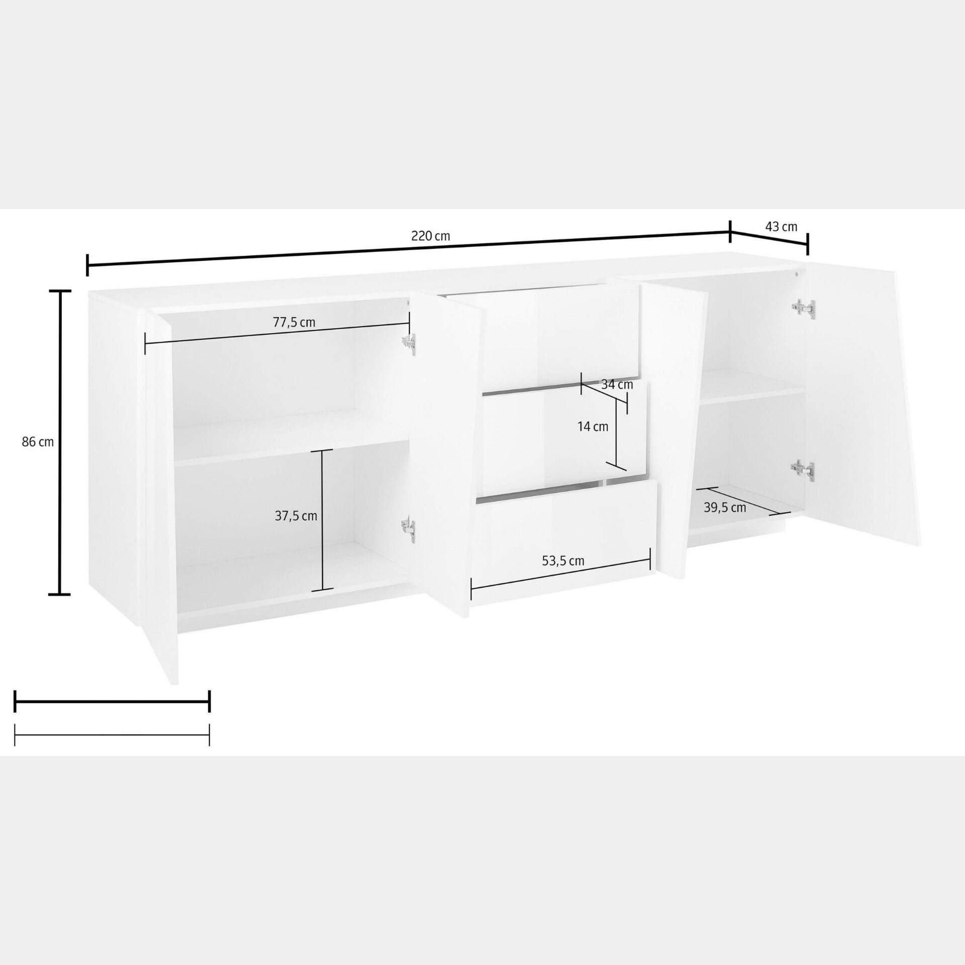 Questo è un particolare che rende questa madia estremamente di tendenza, con un design pulito ma accattivante. La madia è molto capiente, all'interno di ogni anta c'è una mensola che divide lo spazio a metà. E' disponibile in finitura bianco lucido oppure ardesia. A completare la collezione sono presenti anche la madia a 4 ante, la madia più piccola a 2 ante e 3 cassetti, la madia alta, e 2 porta tv di diverse dimensioni.