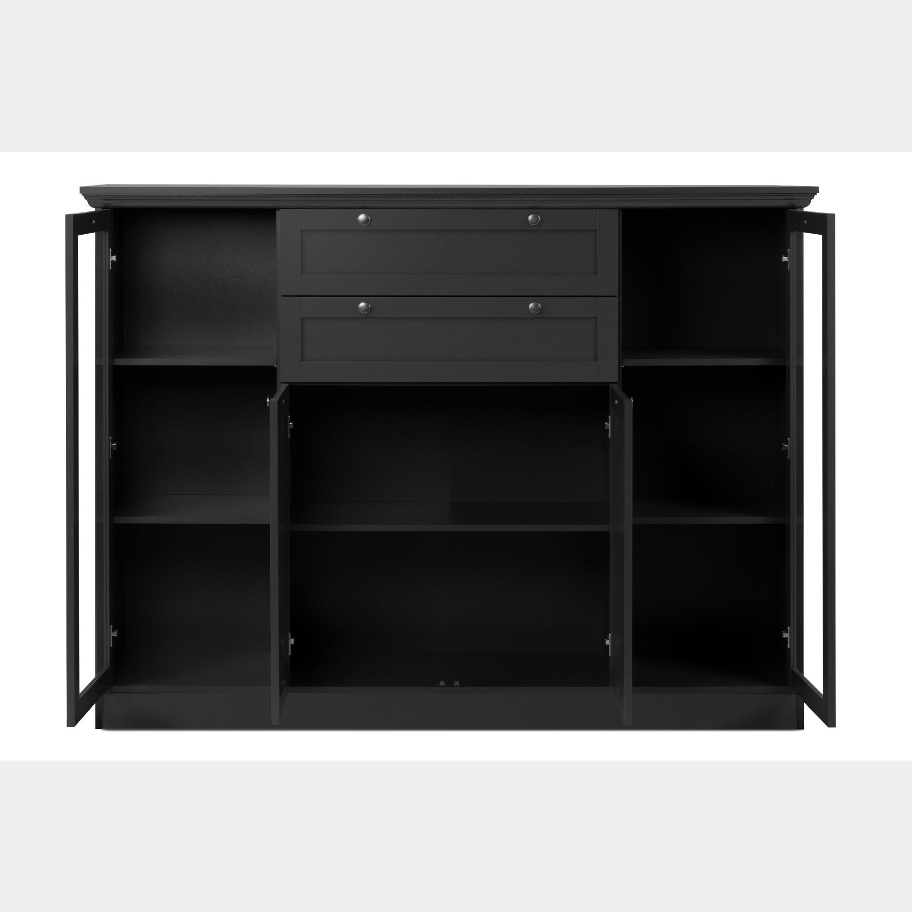 La madia è composta da 2 ante in vetro, 2 ante in finitura bianco e 2 cassetti. Grazie a questa suddivisione la madia risulta estremamente capiente e pratica. All'interno delle ante in vetro sono presenti 2 ripiani mentre in quelle centrali uno.