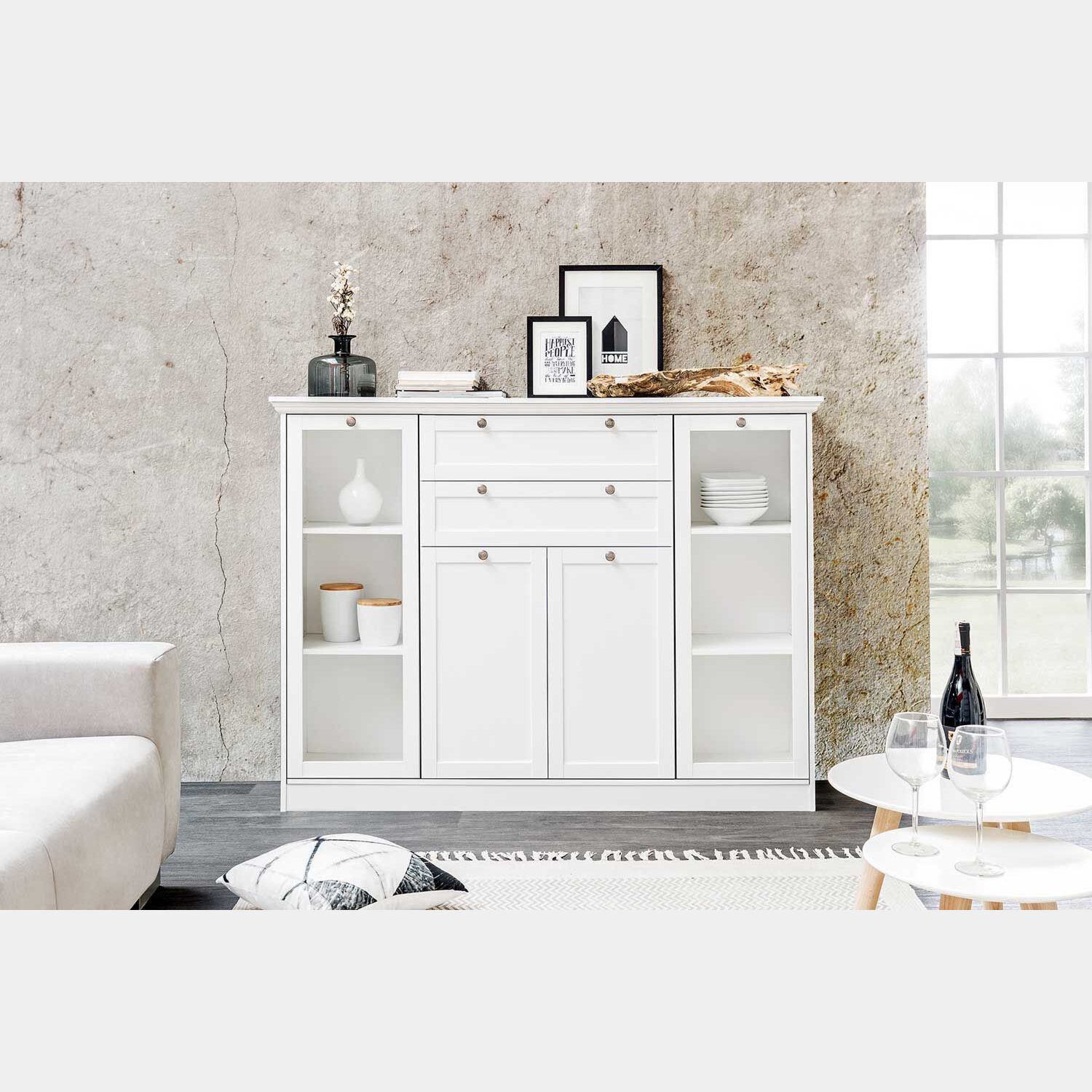 La madia è composta da 2 ante in vetro, 2 ante in finitura bianco e 2 cassetti. Grazie a questa suddivisione la madia risulta estremamente capiente e pratica. All'interno delle ante in vetro sono presenti 2 ripiani mentre in quelle bianche uno.