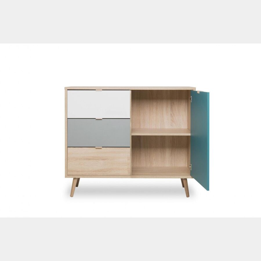 Madia Lavik con gambe in legno, 1 anta 3 cassetti, finitura Quercia, Bianca, Petrolio e Grigia