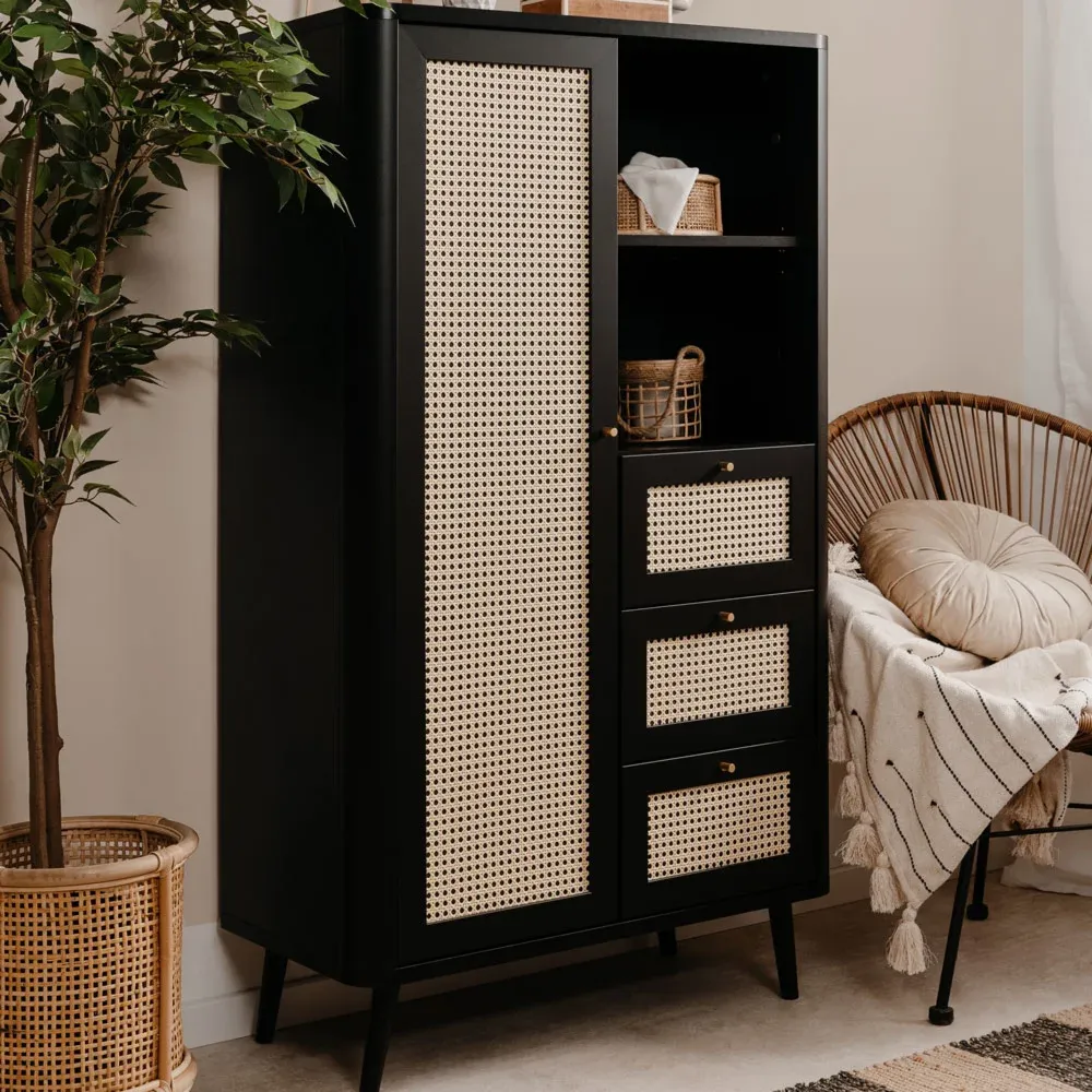 Madia struttura nera e frontale rovere oak con effetto rafia