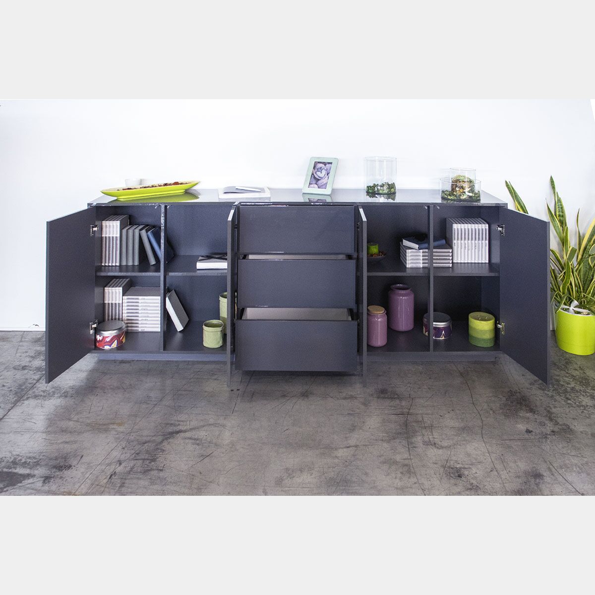 Credenza che nasce innanzitutto per la sua bellezza e la capacità di abbellire gli ambienti, merito soprattutto dell'essenza antracite laccata lucida, singolare e raffinata che regala al contesto eleganza ma non solo, il mobile si rende un elemento funzionale e indicato per organizzare lo spazio e mantenere un ordine rigoroso grazie alla presenta di tre pratici cassetti posti al centro della madia e due ante laterali con apertura battente verso l'esterno dove riporre il servizio di posate e la biancheria per la tavola o altri elementi per la zona living.