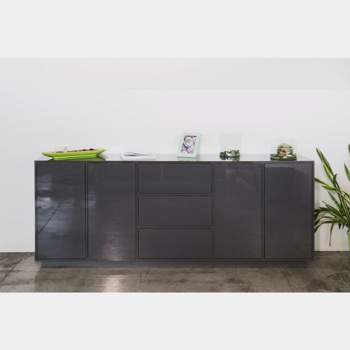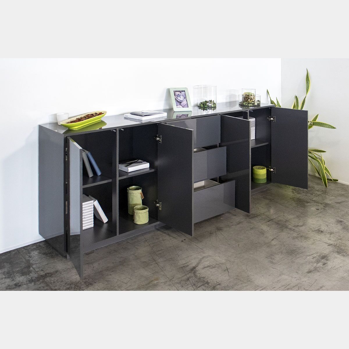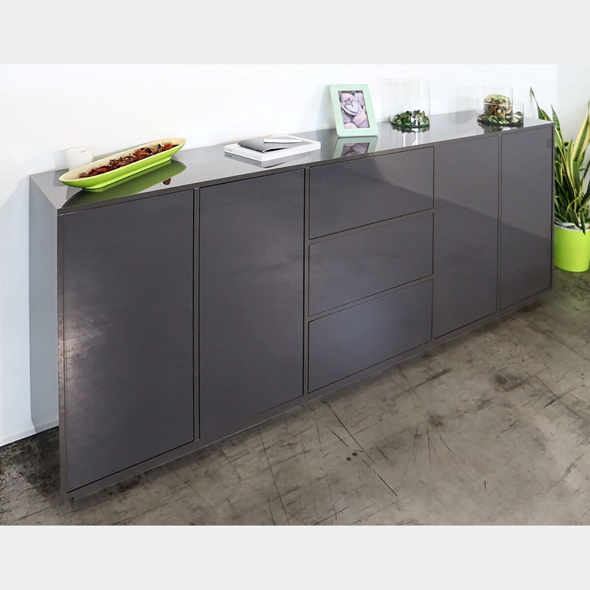 Madia in appoggio antracite laccata lucida con due ante e tre cassetti
