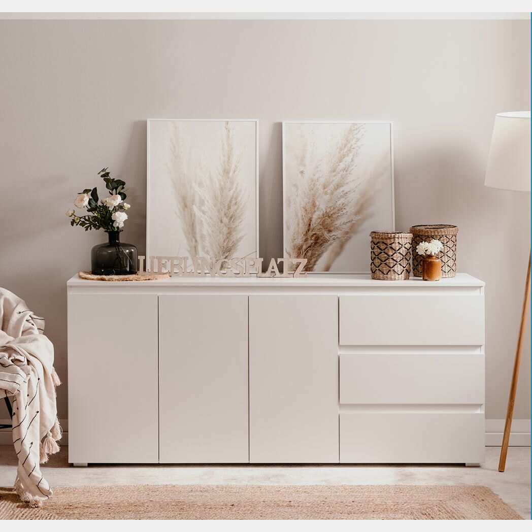 Madia in finitura bianca opaca in stile scandinavo, tre ante e tre cassetti