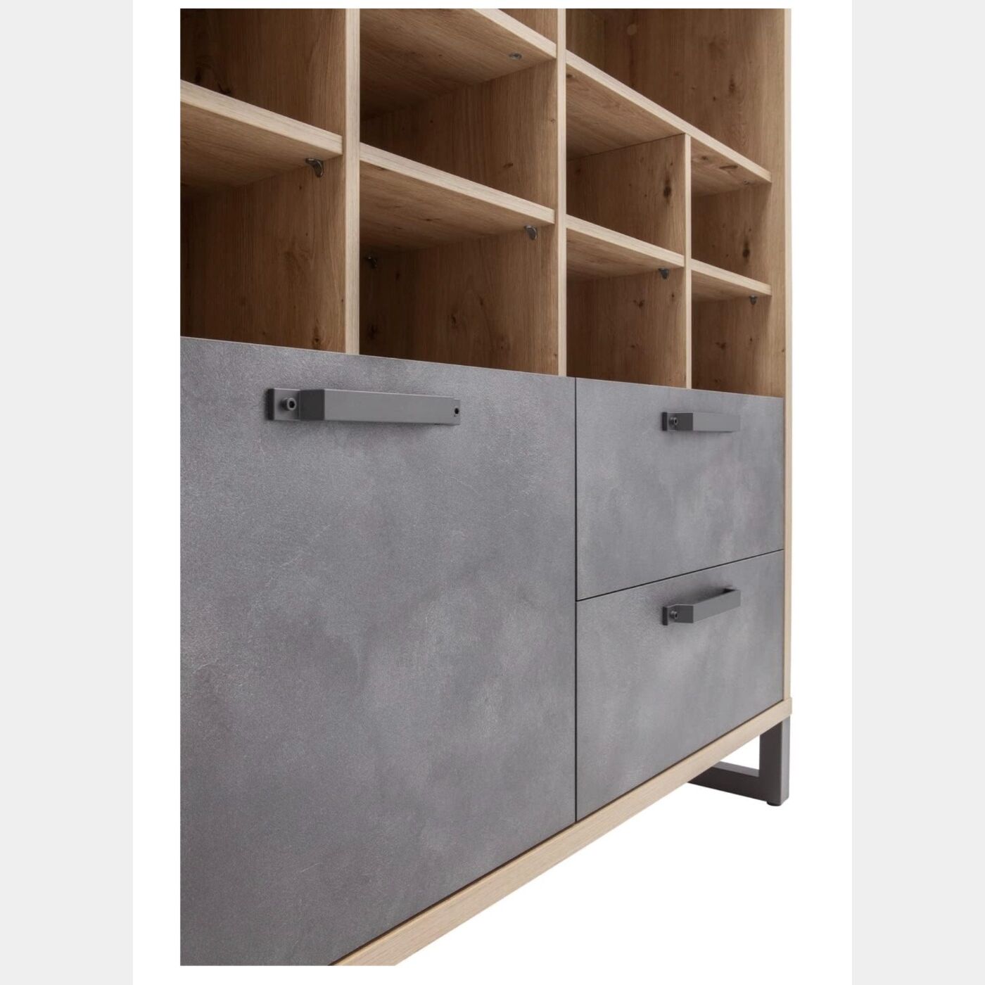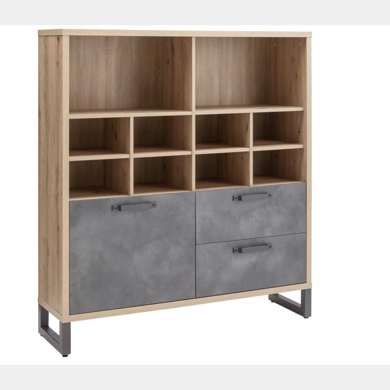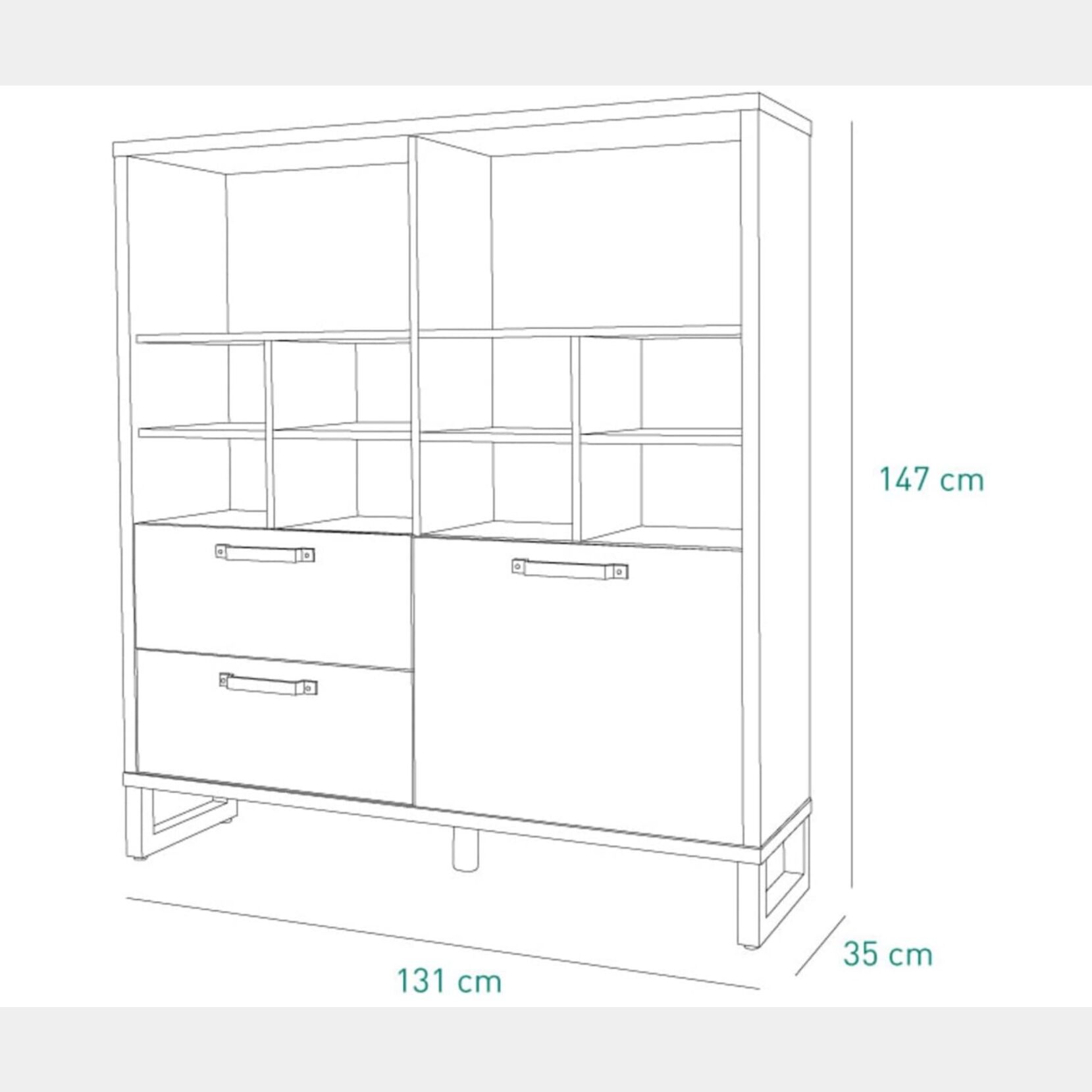 La libreria è pensata per offrire un ampio spazio di appoggio per libri e documenti vari, per questo sono presenti 2 cassetti e un'anta nella parte inferiore. Superiormente si trovano 2 vani maggiori e 8 piccoli vani, la finitura della struttura è in Rovere mentre piedini, maniglie e frontali sono in Grigio smoke.