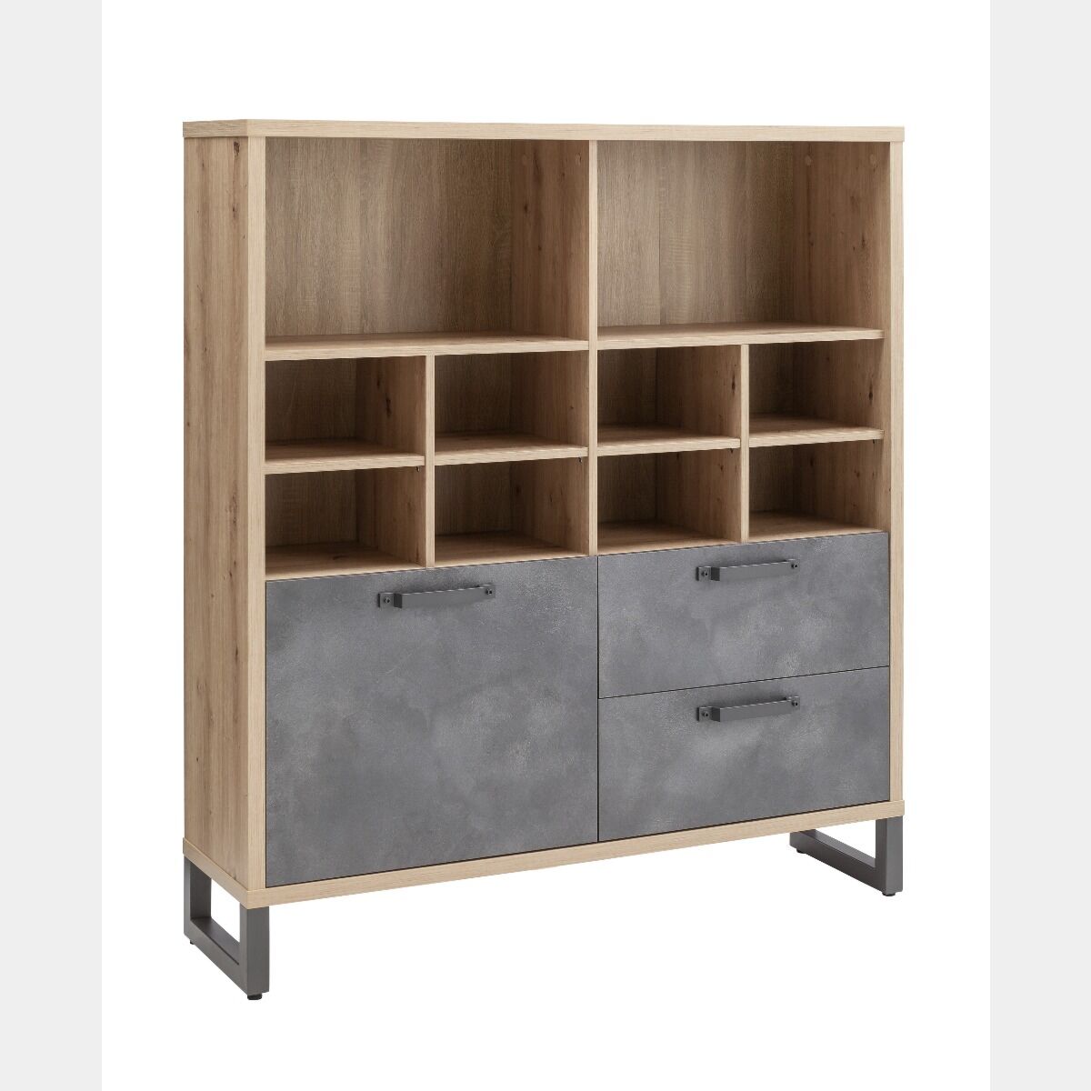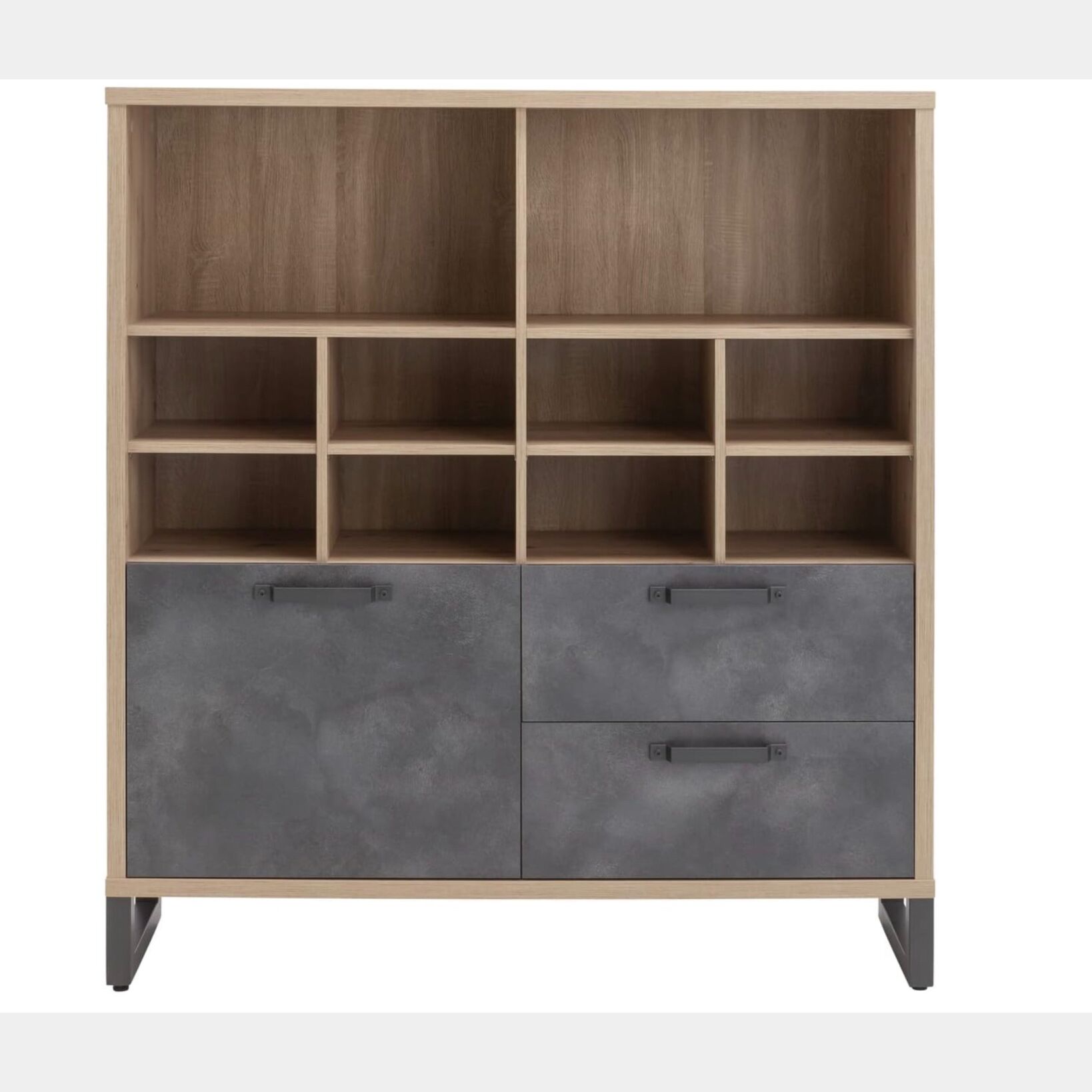 Libreria Industry per ufficio con 2 cassetti e un'anta in finitura Rovere e Grigio smoke
