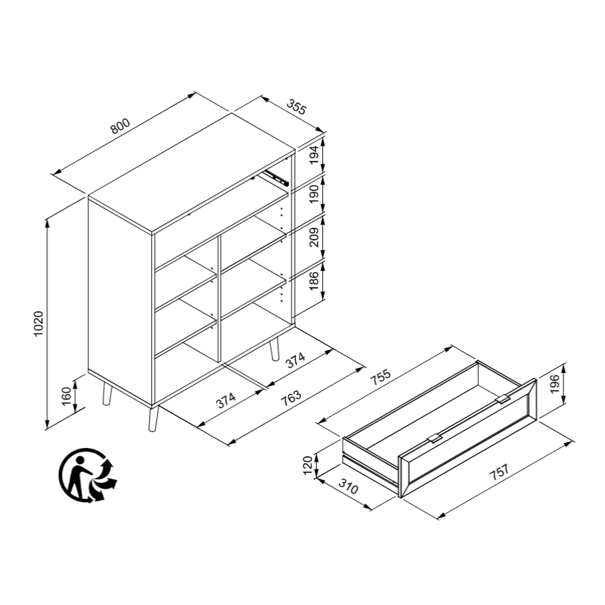 La madia presenta 2 ante con due ripiani ciascuna, suddivisione interna che assicura la massima capienza e funzionalità. Nella parte superiore si trova un pratico cassetto dotato di due piccole e particolari maniglie che riprendono quelle poste nelle ante.