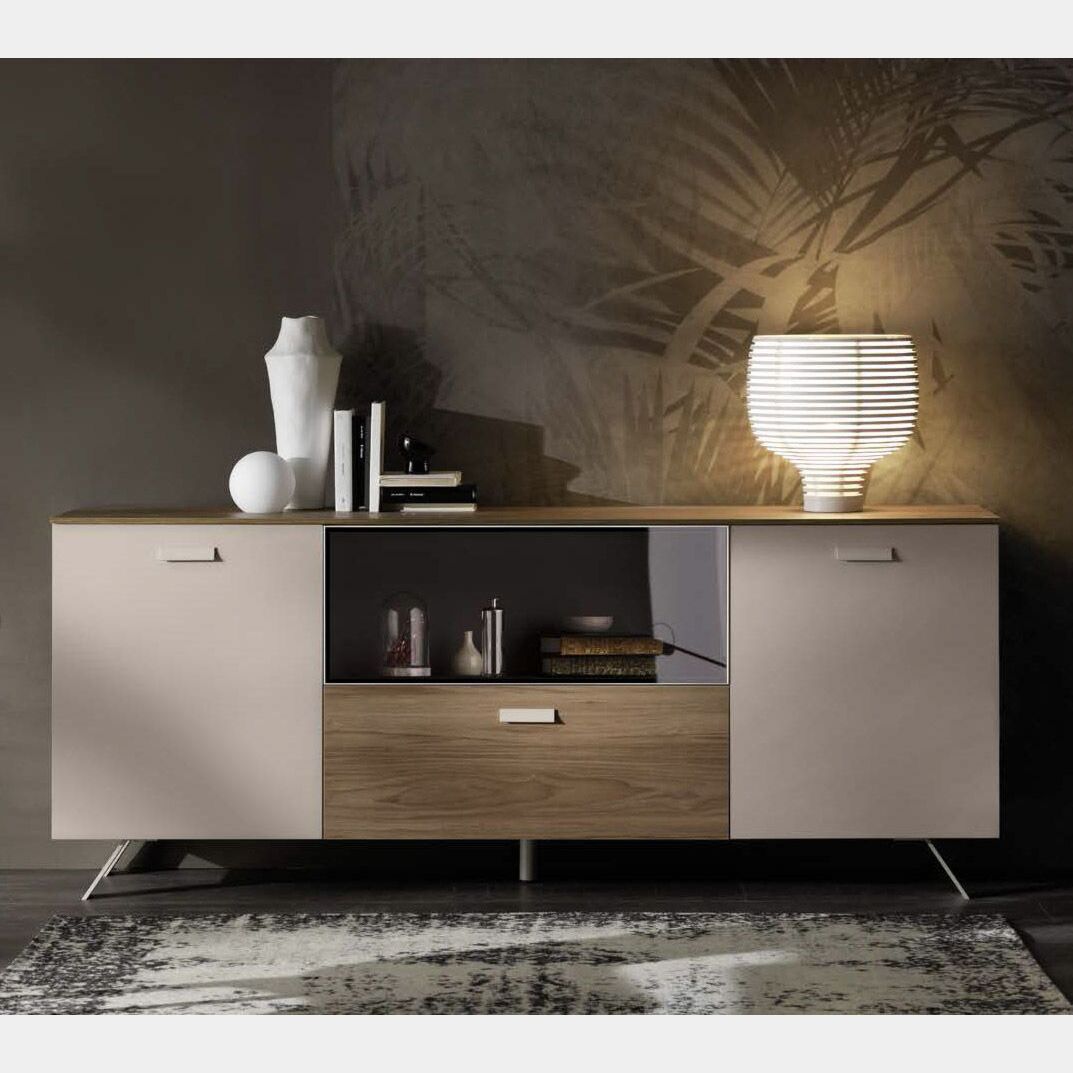 Madia Kerid di qualità con 2 ante, 1 cassetto e una ribalta vetro in finitura Cachemire e Noce naturale