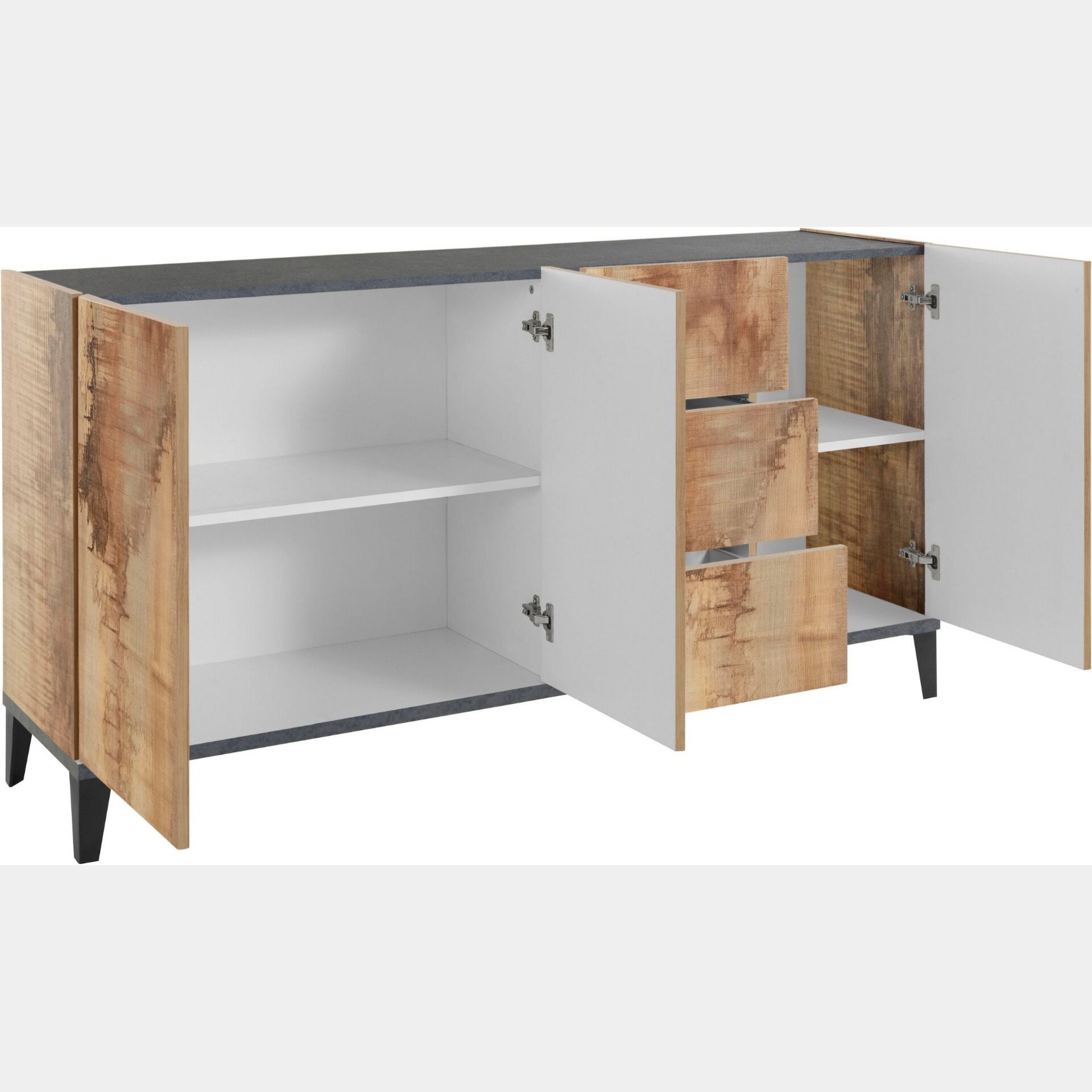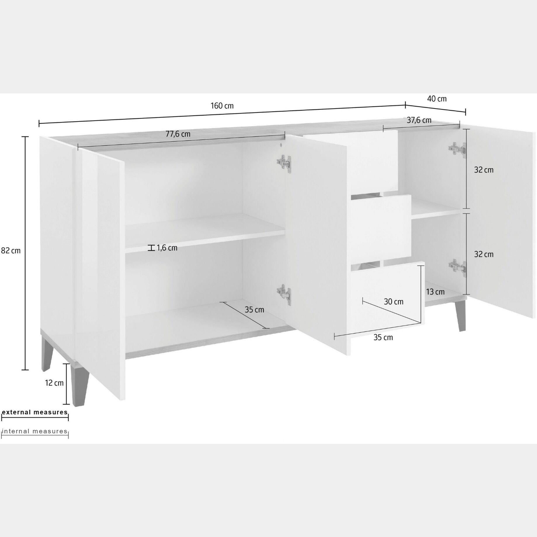 La madia ha una suddivisione interna dello spazio studiata per offrire la massima capienza, sono presenti infatti 3 ante battenti con un ripiano centrale e 3 cassetti. L'apertura delle ante è facilitata dall'altezza maggiore del pannello rispetto al top, questo per assicurare la comodità nel'utilizzo quotidiano.