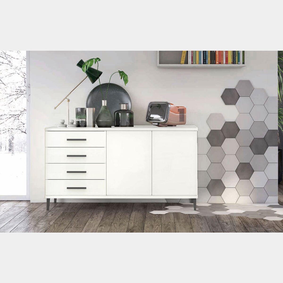 Madia moderna 2 ante 4 cassetti con piedini in titanio, finitura Bianco Opaco