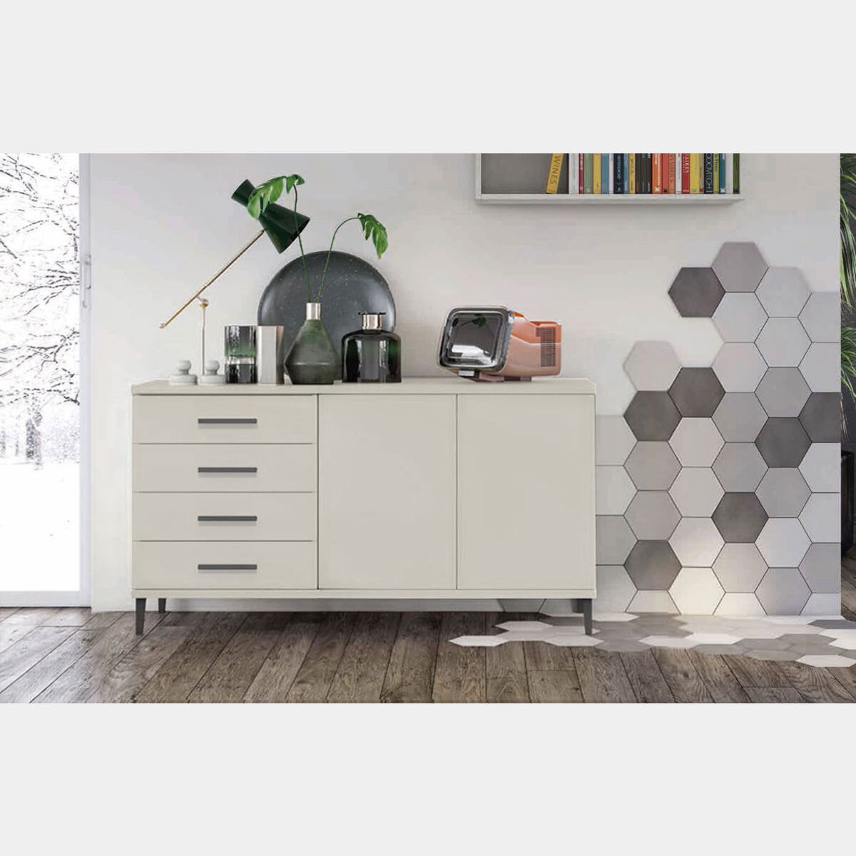 Madia 2 ante 4 cassetti per la zona living.La madia della collezione Aquila per soggiorno è in finitura Grigio dorian e poggia su 4 piedini Sigma di colore Grigio Titanio.