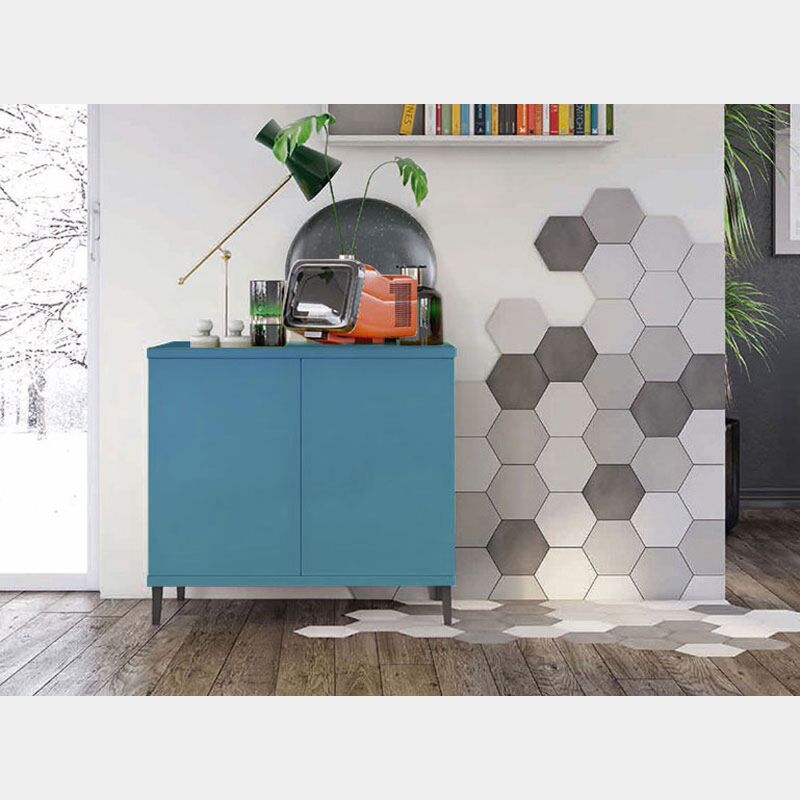 La madia della collezione Aquila per zona living è in finitura Blu egeo e poggia su 4 piedini Sigma di colore Grigio Titanio.