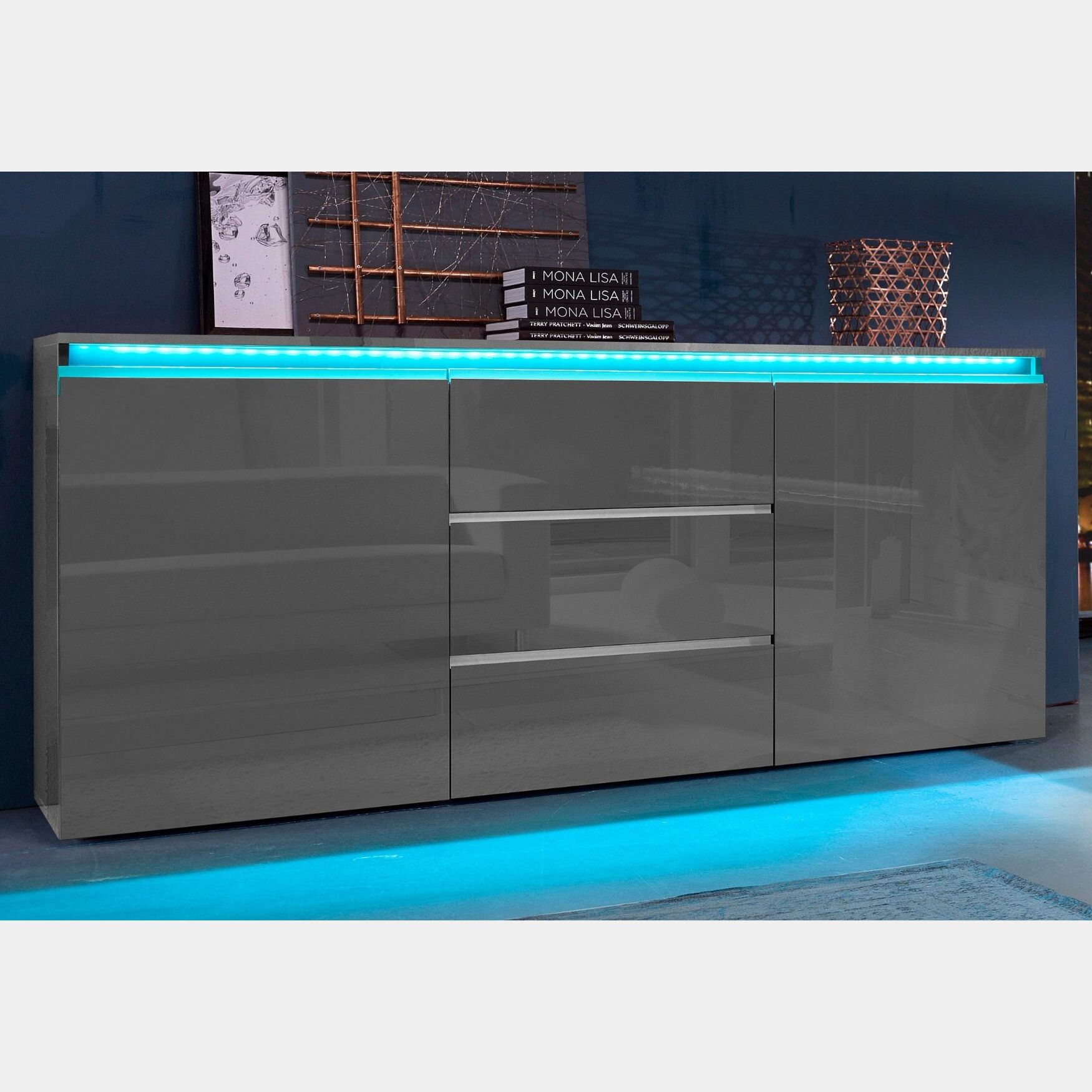 La credenza antracite lucida è una soluzione utile sia nella zona ingresso sia in soggiorno e in sala da pranzo.