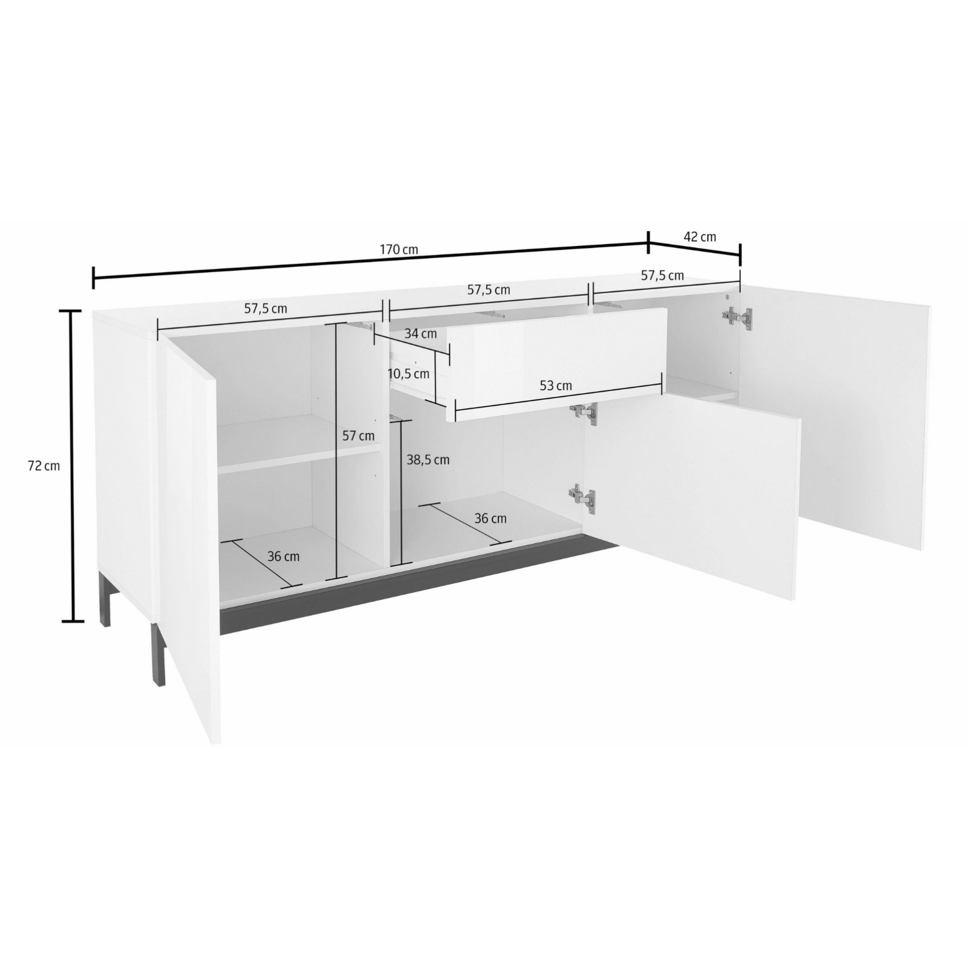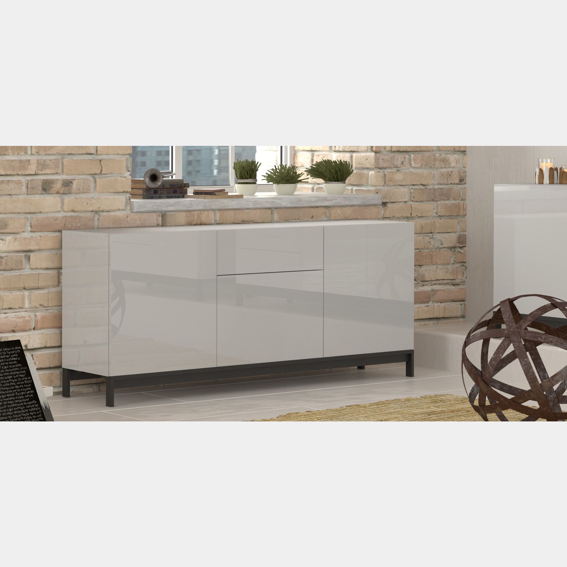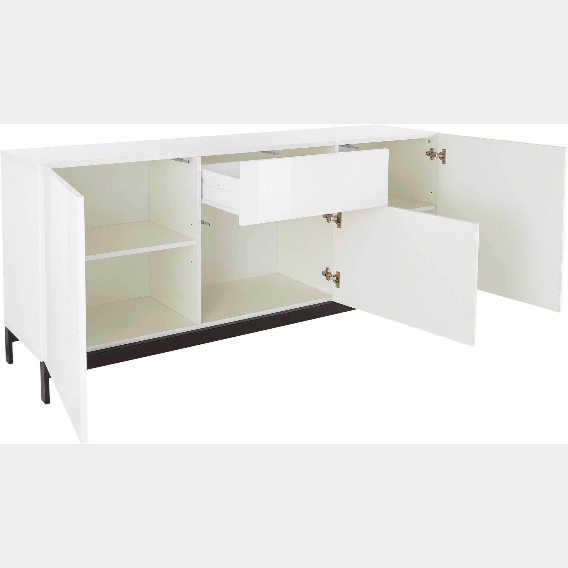 Madia di design 1 cassetto 3 ante in finitura bianco lucidoL'aspetto completamente elegante di questa madia moderna convince già a prima vista. Le sue forme squadrate e contenute sono ideali per piccoli spazi. Inoltre, porte e cassetti sono dotati dell'apertura push-pull, agevolandone l'apertura. La qualità del materiale in legno certificato FSC®. Le gambe della madia invece sono in metallo finitura nera.