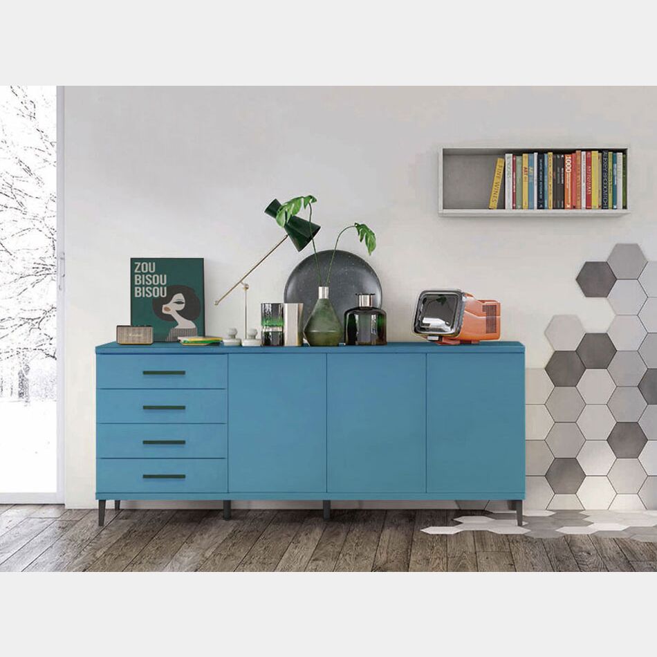 La madia della collezione Aquila per soggiorno è in finitura Blu egeo e poggia su 4 piedini Sigma di colore Grigio Titanio e 2 piedini Gamma.