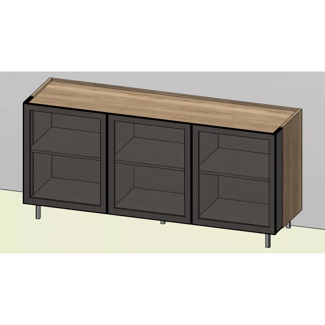 La madia moderna presenta tre ante in vetro fumè con telaio nero e piedini cromati, la scocca viene proposta in una calda tinta legno, il Rovere chiaro, che contribuisce a rendere l'ambiente accogliente e informale.