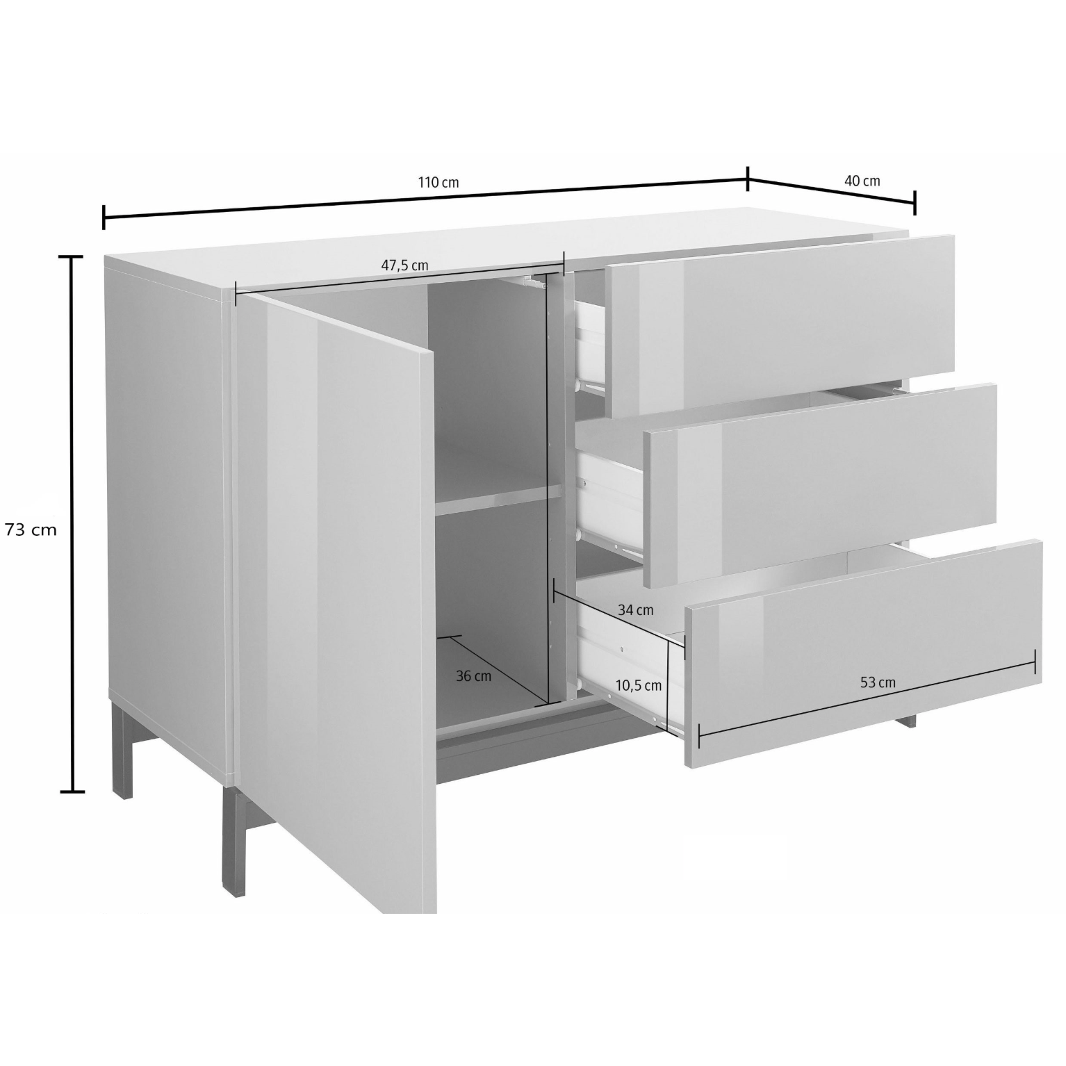 Madia di design 3 cassetti 1 anta in finitura antracite lucidoL'aspetto completamente elegante di questa madia moderna convince già a prima vista. Le sue forme squadrate e contenute sono ideali per piccoli spazi. Inoltre, porte e cassetti sono dotati dell'apertura push-pull, agevolandone l'apertura. La qualità del materiale in legno certificato FSC®. Le gambe della madia invece sono in metallo finitura nera.