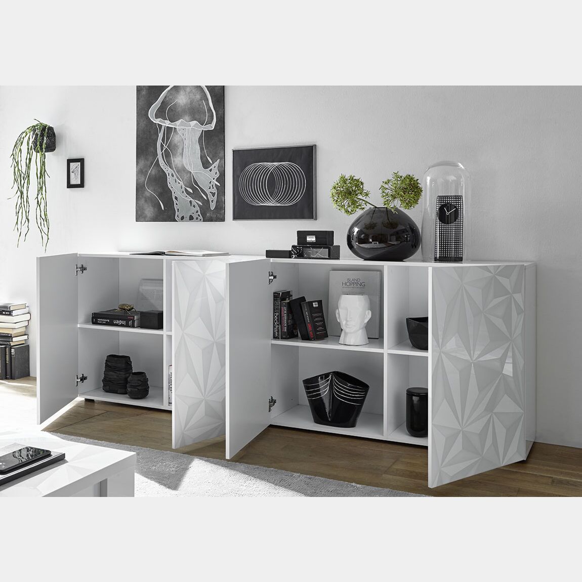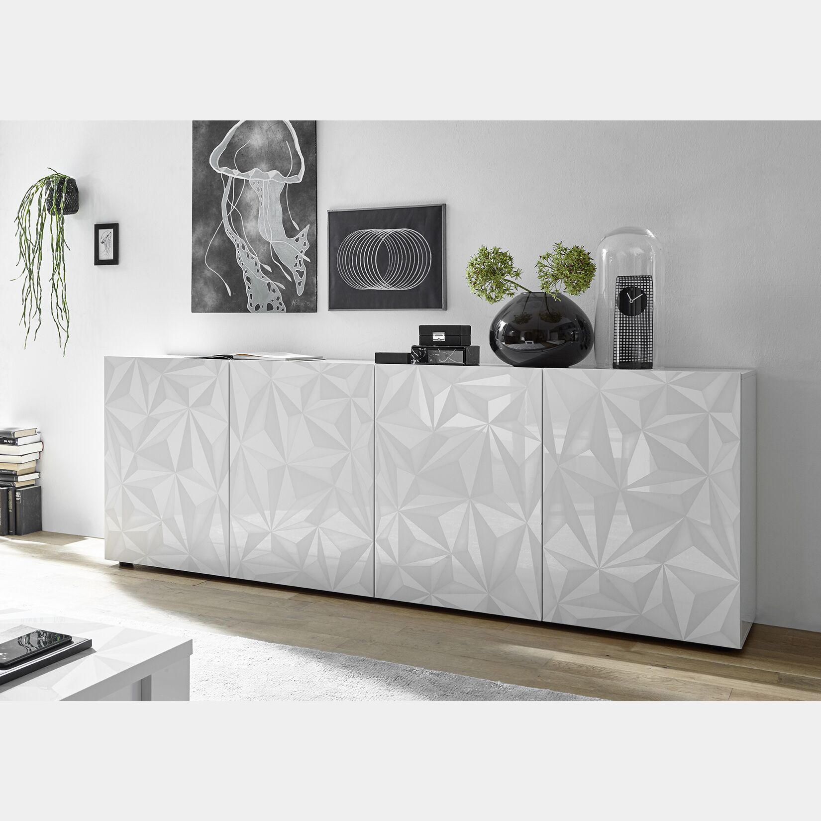 Madia moderna 4 ante in finitura bianco laccato lucido con serigrafia prismatica. - Madia a 4 ante, moderna e di design. La madia è serigrafata con decorazione prismatica e in finitura bianco laccato lucido. All'interno la madia è suddivisa da 1 ripiano per ogni anta battente.