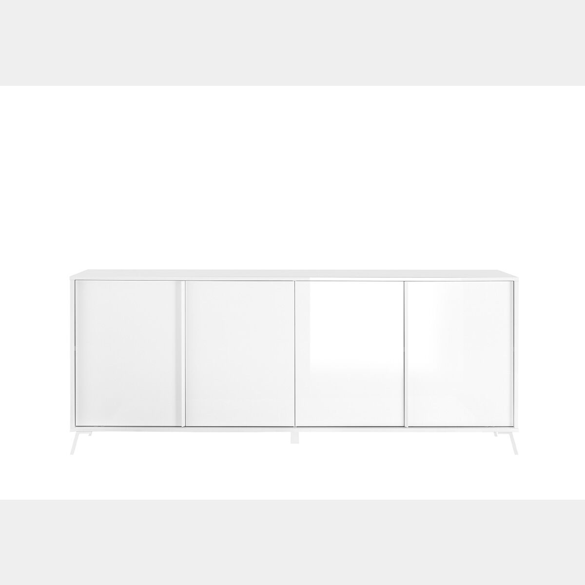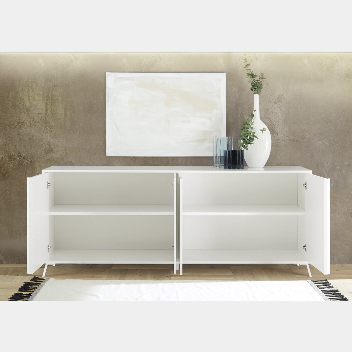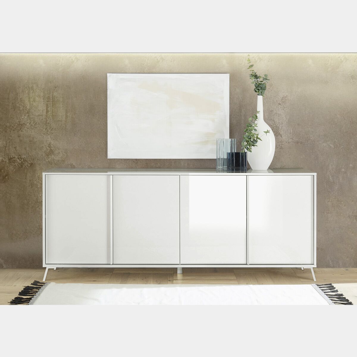 La madia proposta da ZenzeroShop per questa nuova collezione "Mobili Leg" unisce la finitura Bianco Lucido con una struttura dallo stile minimal e moderno che si accosta molto bene a qualsiasi tipo di arredamento moderno, classico o industriale. La madia è dotata di 4 ante battenti che una volta aperte con delle maniglie dal design bianco mostrano l'interno chiaro e le 2 mensole su cui disporre la propria oggettistica.