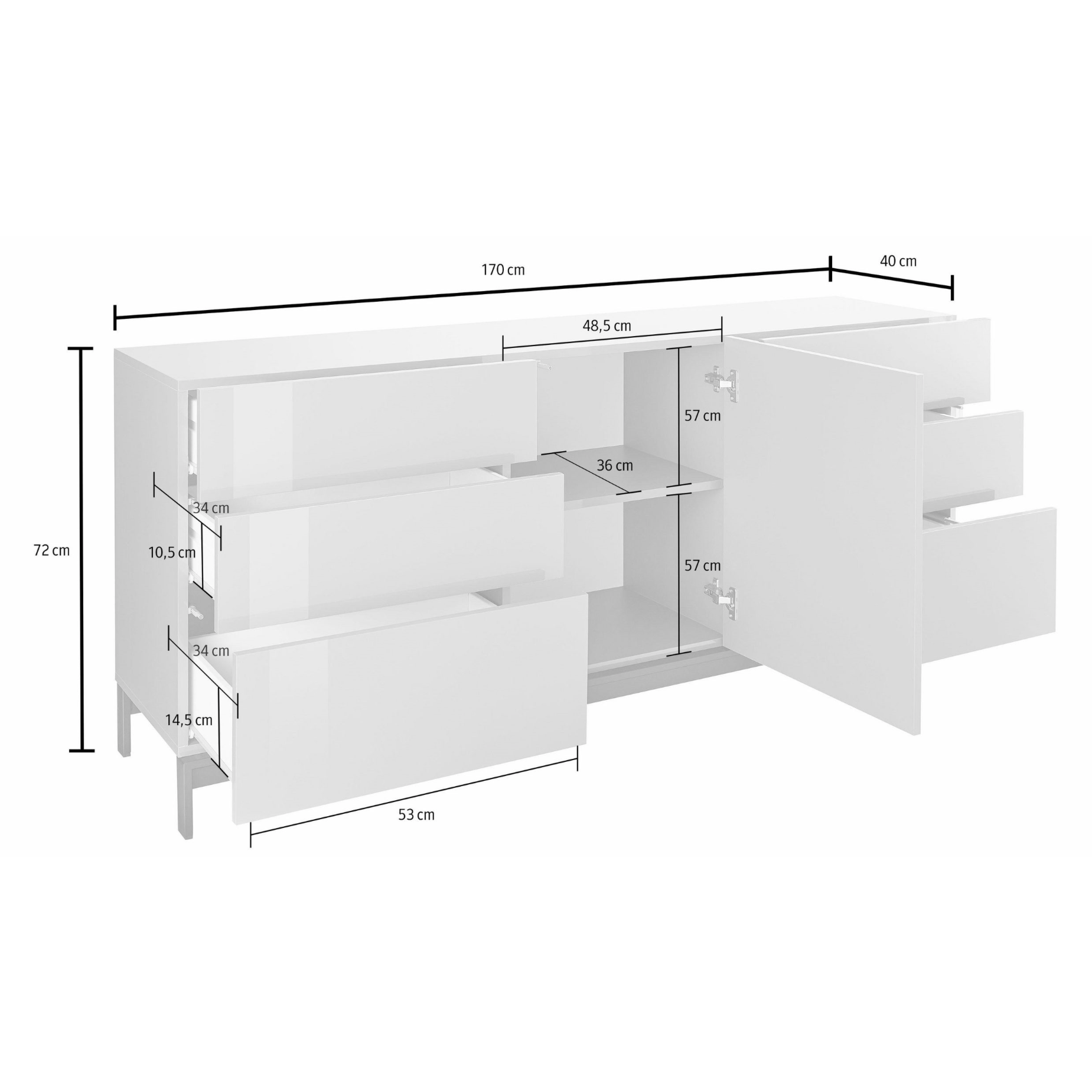 Madia di design 6 cassetti 1 anta in finitura bianco lucidoL'aspetto completamente elegante di questa madia moderna convince già a prima vista. Le sue forme squadrate e contenute sono ideali per piccoli spazi. Inoltre, porte e cassetti sono dotati dell'apertura push-pull, agevolandone l'apertura. La qualità del materiale in legno certificato FSC®. Le gambe della madia invece sono in metallo finitura nera.
