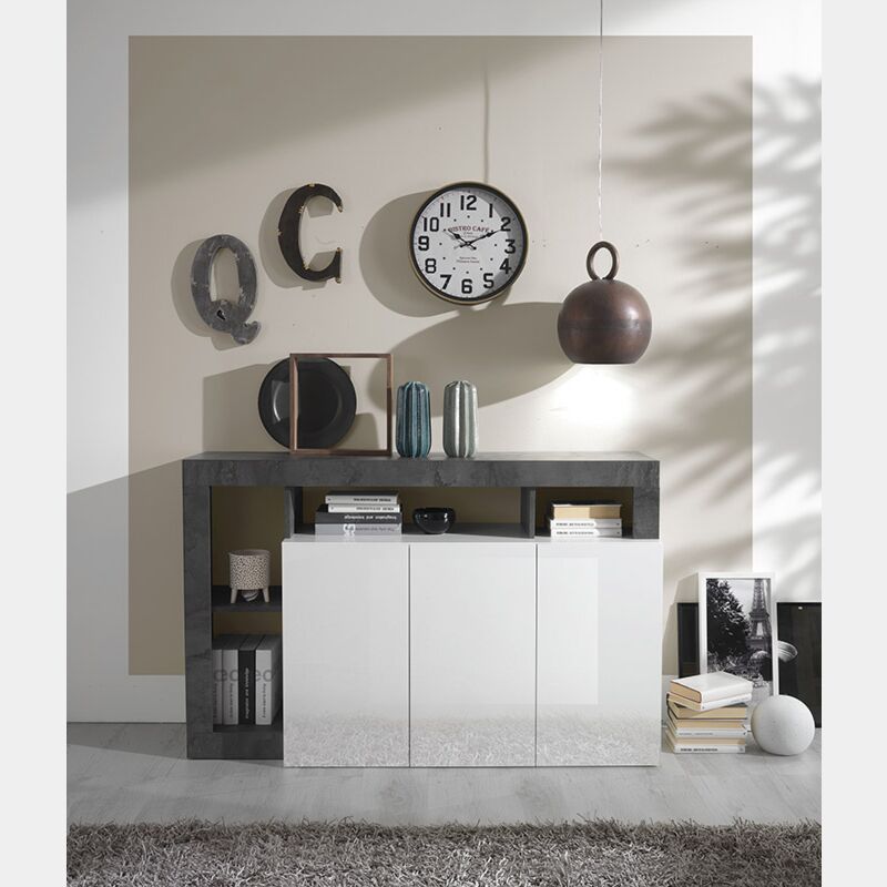 Madia moderna a 3 ante con un ripiano in finitura bianco laccato lucido e ossido