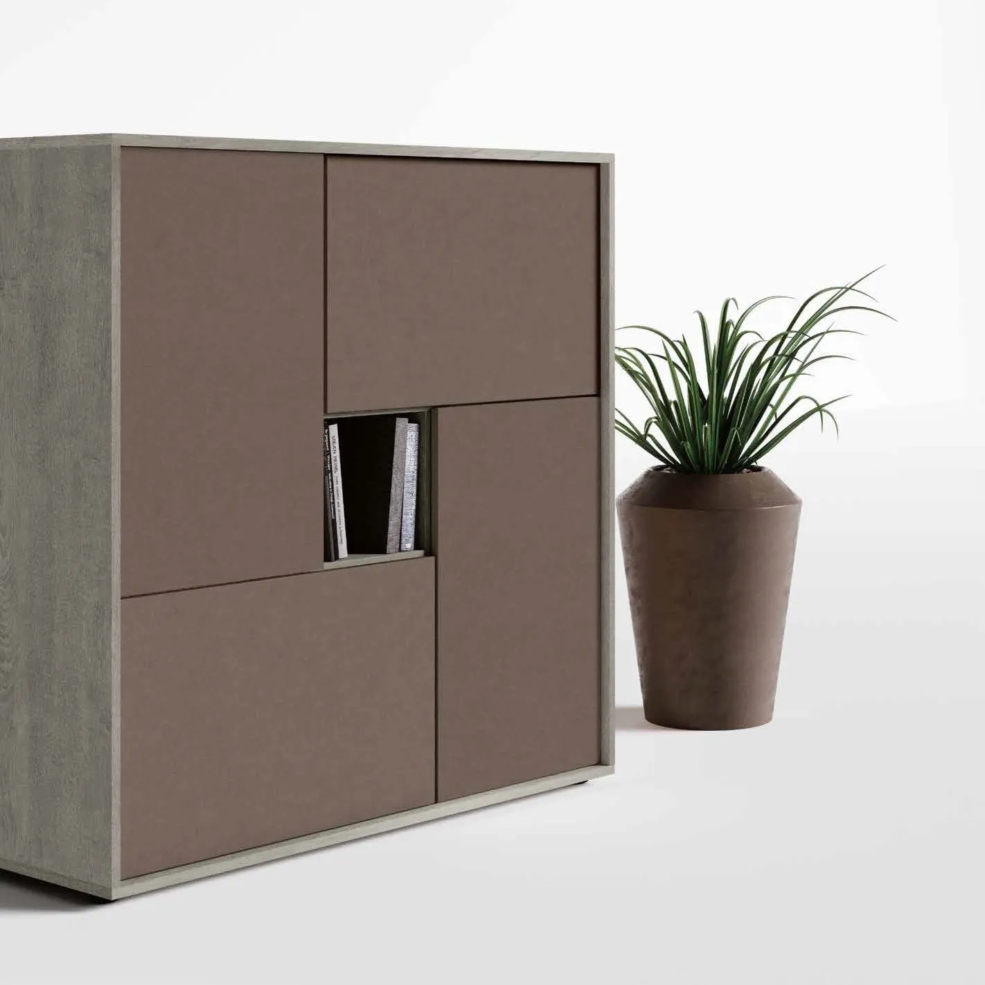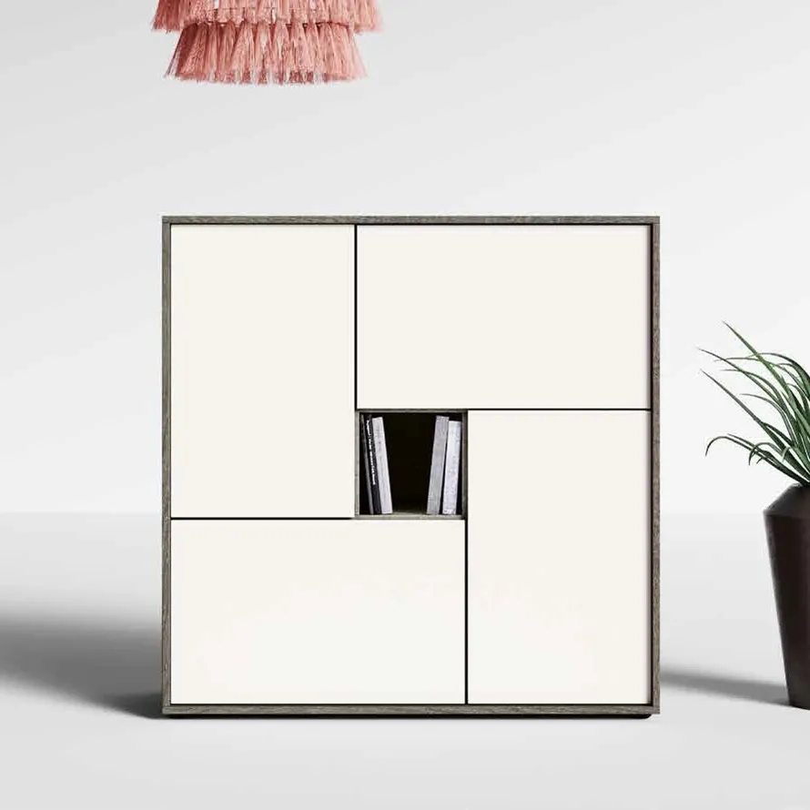 Pensata per un arredamento moderno la madia diventa il perfetto complemento d'arredo per living, open space e soggiorni. L'accostamento di finiture a contrasto enfatizza le linee geometriche del mobile, dondando carattere e movimento all'ambiente.