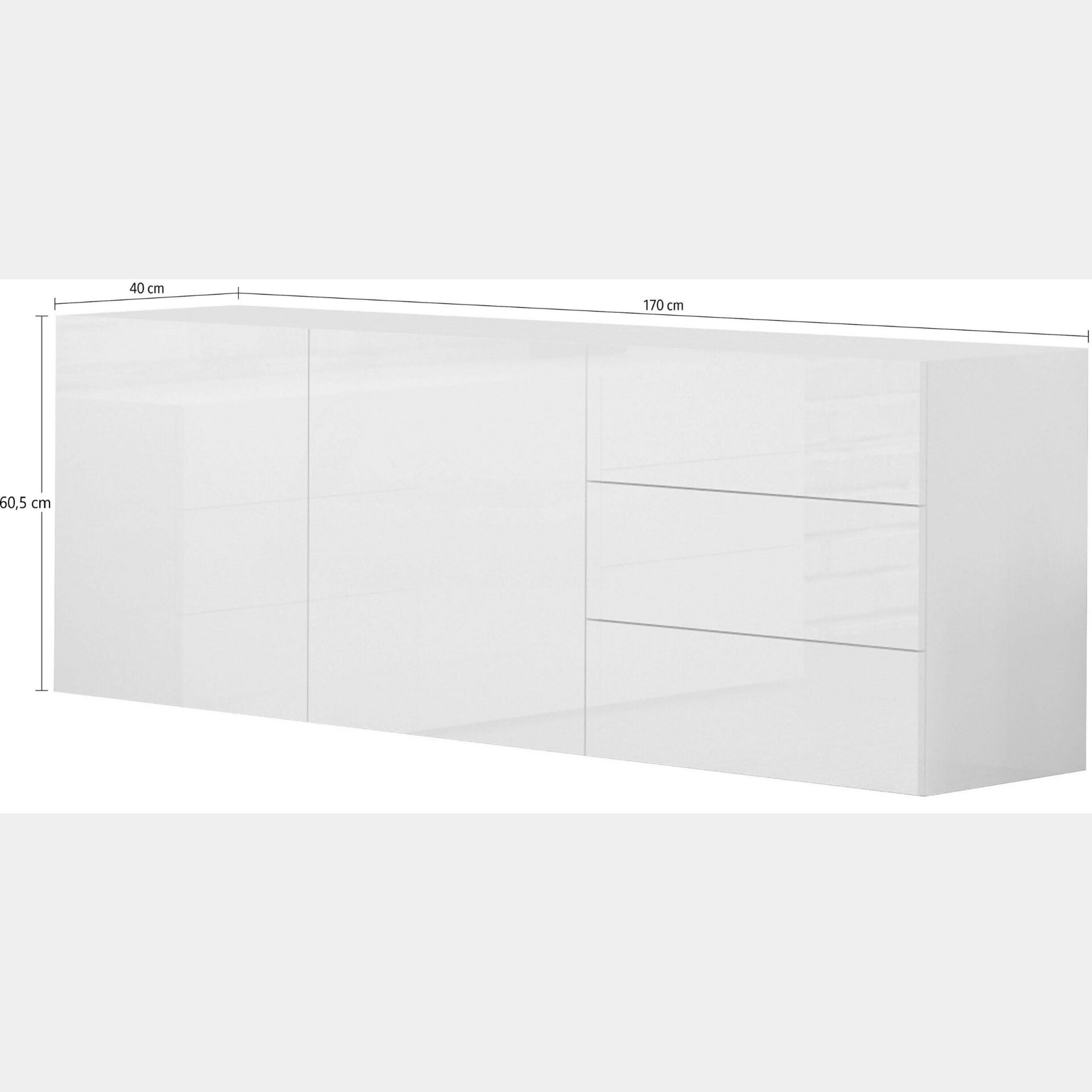 La struttura è costituita da due ante battenti con all’interno un grande ripiano in legno e da tre cassetti con apertura push-pull. Il mobile è in melaminico antracite laccato lucido e certificato FSC.
