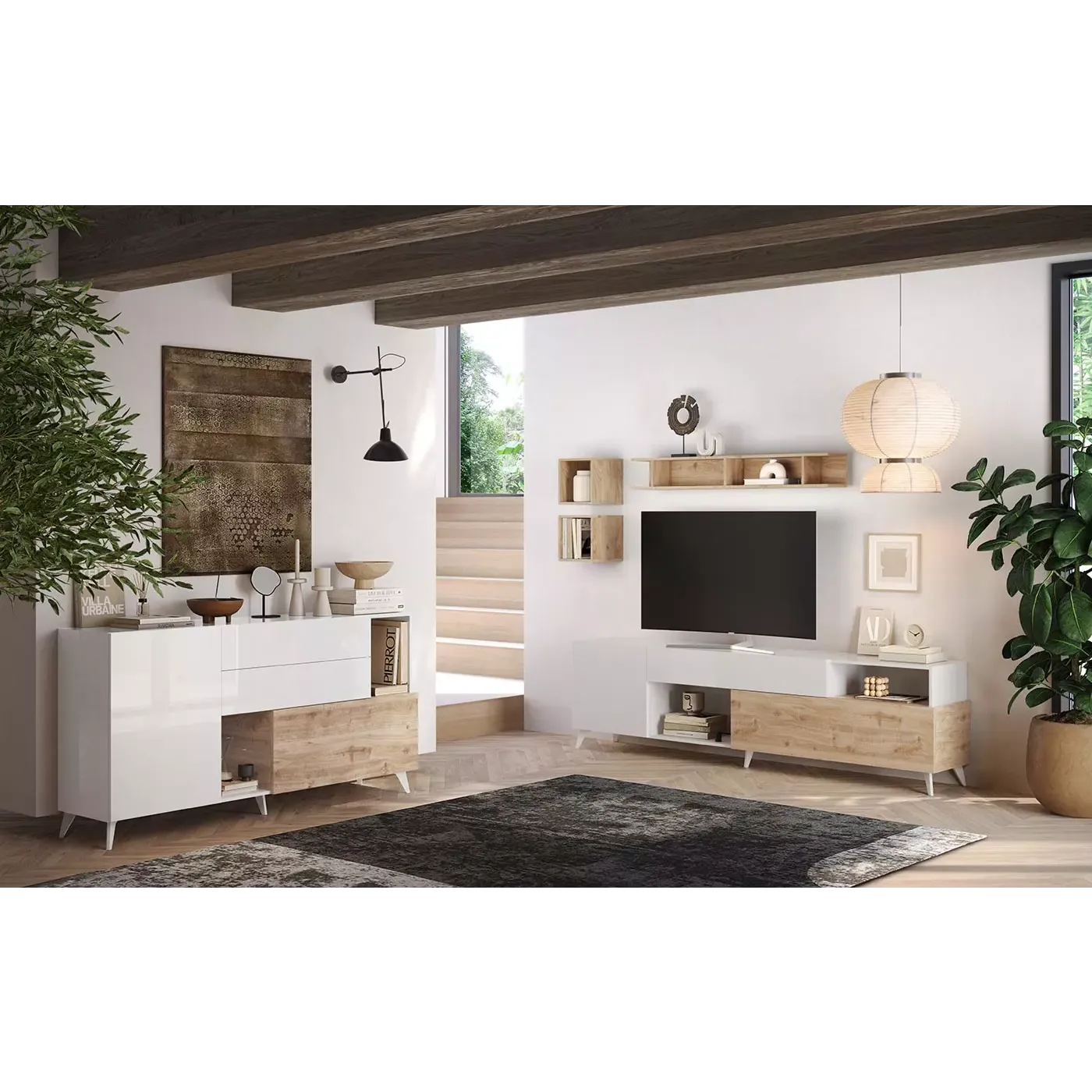 All'elegante finitura Bianco lucido si accosta una tinta legno, il Cadiz, che evidenza il design della ribalta.