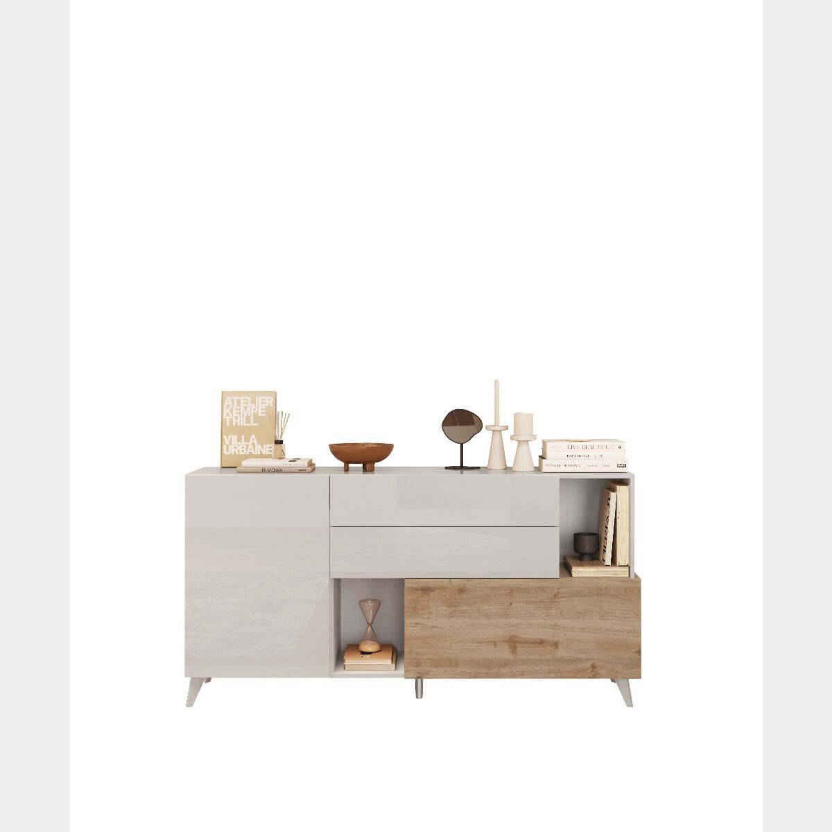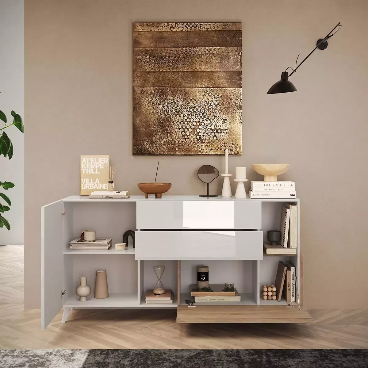 La credenza, grazie alle sue dimensioni e alla suddivisione interna, offre un notevole spazio cui riporre diversi oggetti. Dotata di un'anta con ripiano, due cassetti, una ribalta e due vani a giorno assicura la massima praticità nel quotidiano.