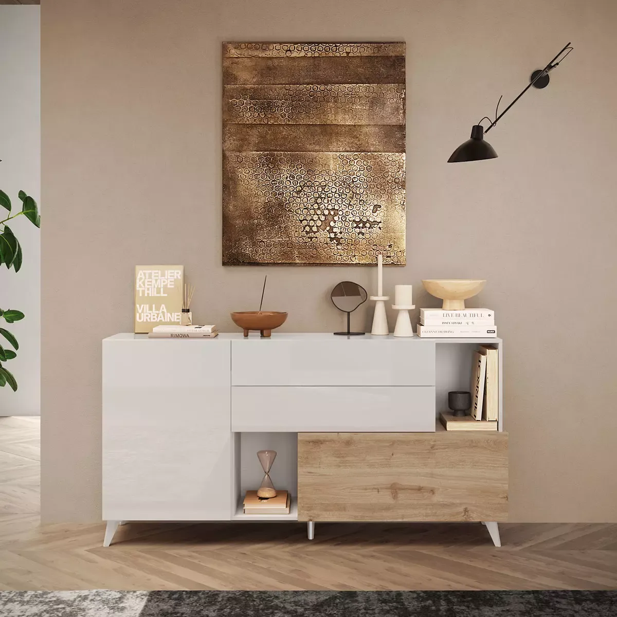 Progettata per soggiorni e open space moderni la madia svolge una doppia funzione: arredare con gusto l'ambiente, assicurando al contempo capienza e funzionalità. I piedini a cono, la linea semplice e pulita e le tinte di dendenza creano un complemento d'arredo ricercato e personale, che ben si adatta ad ingressi, soggiorni, open space o corridoi.