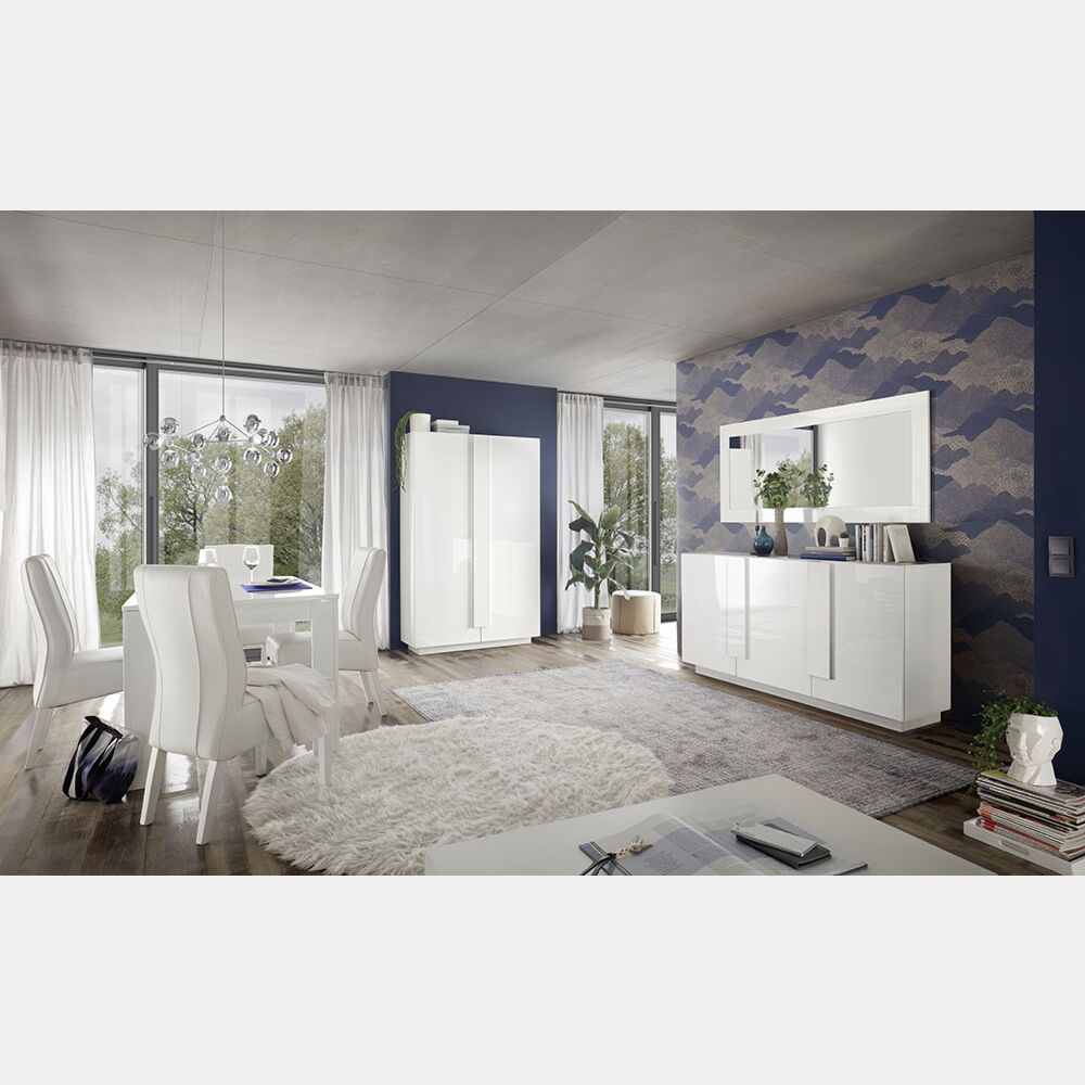 La finitura in Bianco laccato lucido assicura un arredo elegante e raffinato, al contempo, le caratteristiche maniglie rettangolari che percorrono la maggior parte dell'altezza delle ante mantengono uno stile ben definito e pulito: l'effetto finale è una colonna di design che arreda ogni ambiente in cui viene posta con stile.