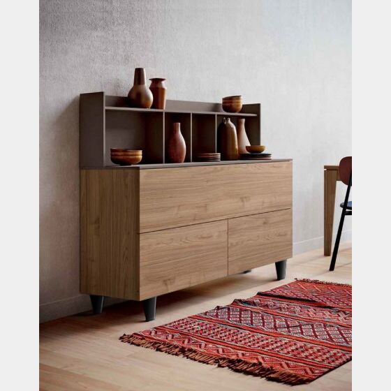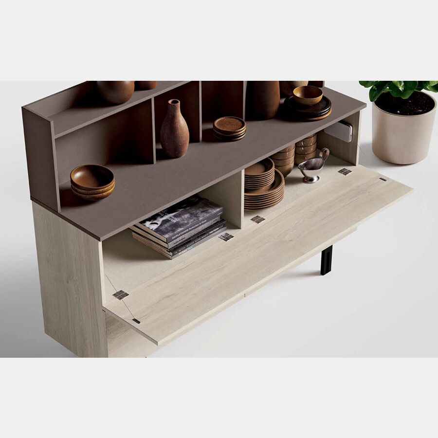 E' formata da un sopralzo composto da diversi vani a giorno: questo permette di posizionare oggetti e soprammobili mettendoli in vista e tenendoli a portata di mano. E' presente una ribalta che offre un ampio spazio, all'interno è presente un divisorio centrale. Per finire la madia presenta 2 cassetti ambi e spaziosi. La madia viene fornita con i piedini base a rasoterra (H.2cm).