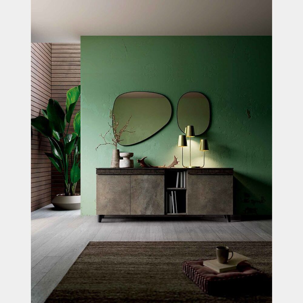 Una nuova concezione dello spazio accoglie il concetto di arredo modulare. La madia, in stile industrial, ha un vano aperto per gli elementi d'arredo e dei comodi scomparti per il contenimento.