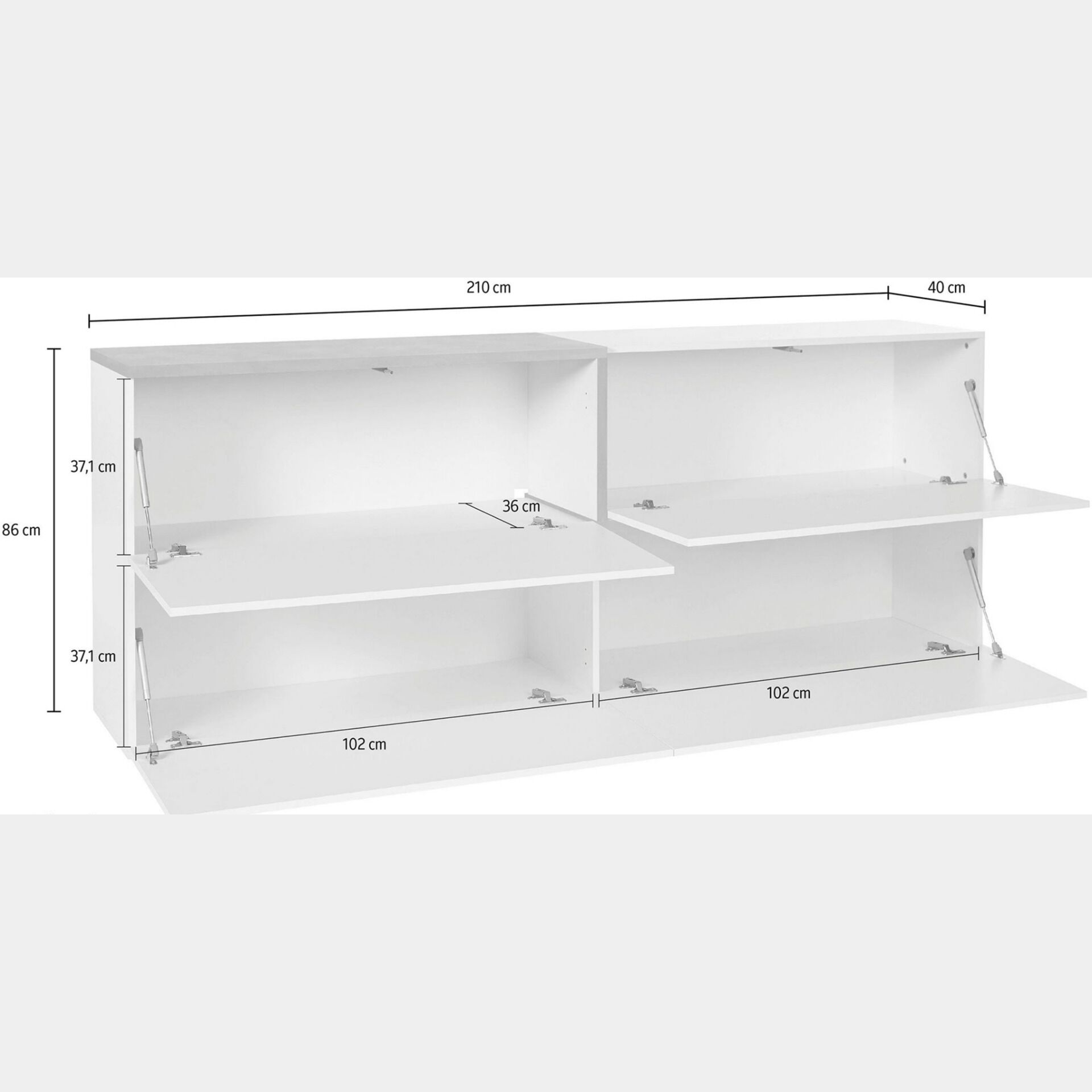 La madia presenta 4 ribalte, dotate di un pistone ciascuna per rallentare l'apertura. I 4 vani hanno una dimensione utile di 102x37.1 cm, questo permette alla madia di essere funzionale e capiente.