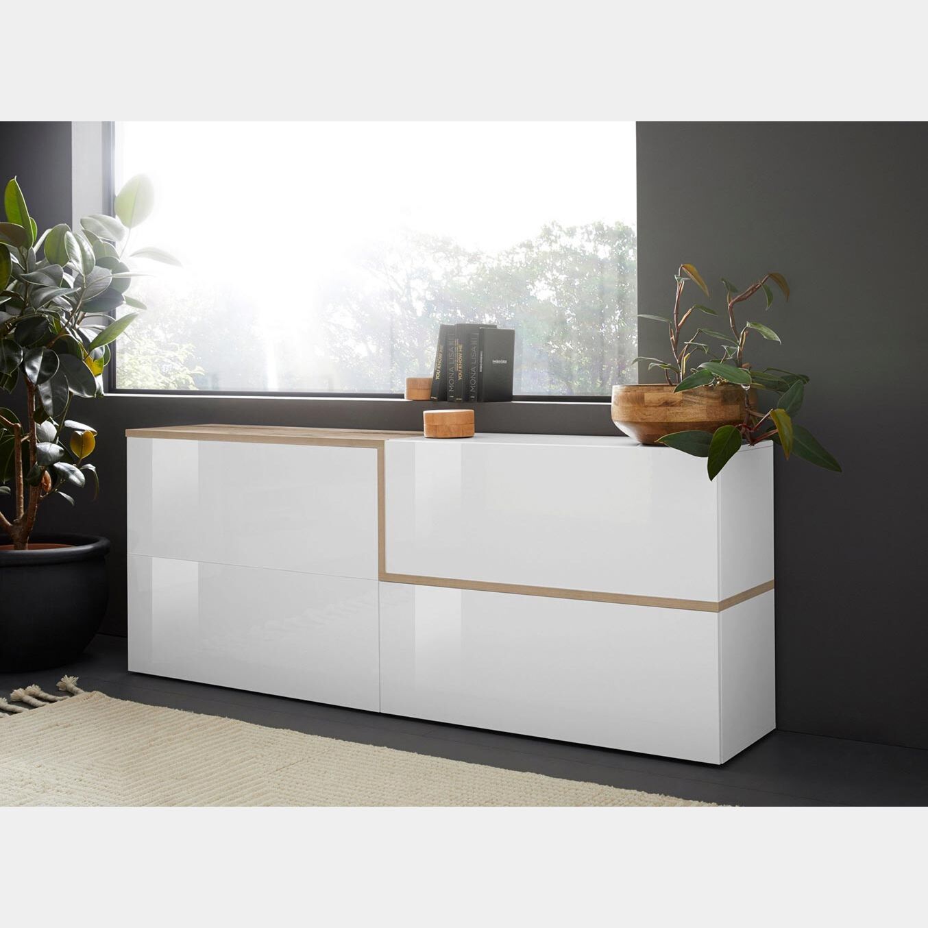 Il design semplice della madia viene valorizzato da un inserto in finitura Pero che attraversa il mobile creando una "Z". L'accostamento della finitura Bianco lucido e Pero assicura un arredo moderno e caratteristico, che personalizza al meglio ogni ambiente della casa, come ingresso, living o cucina.