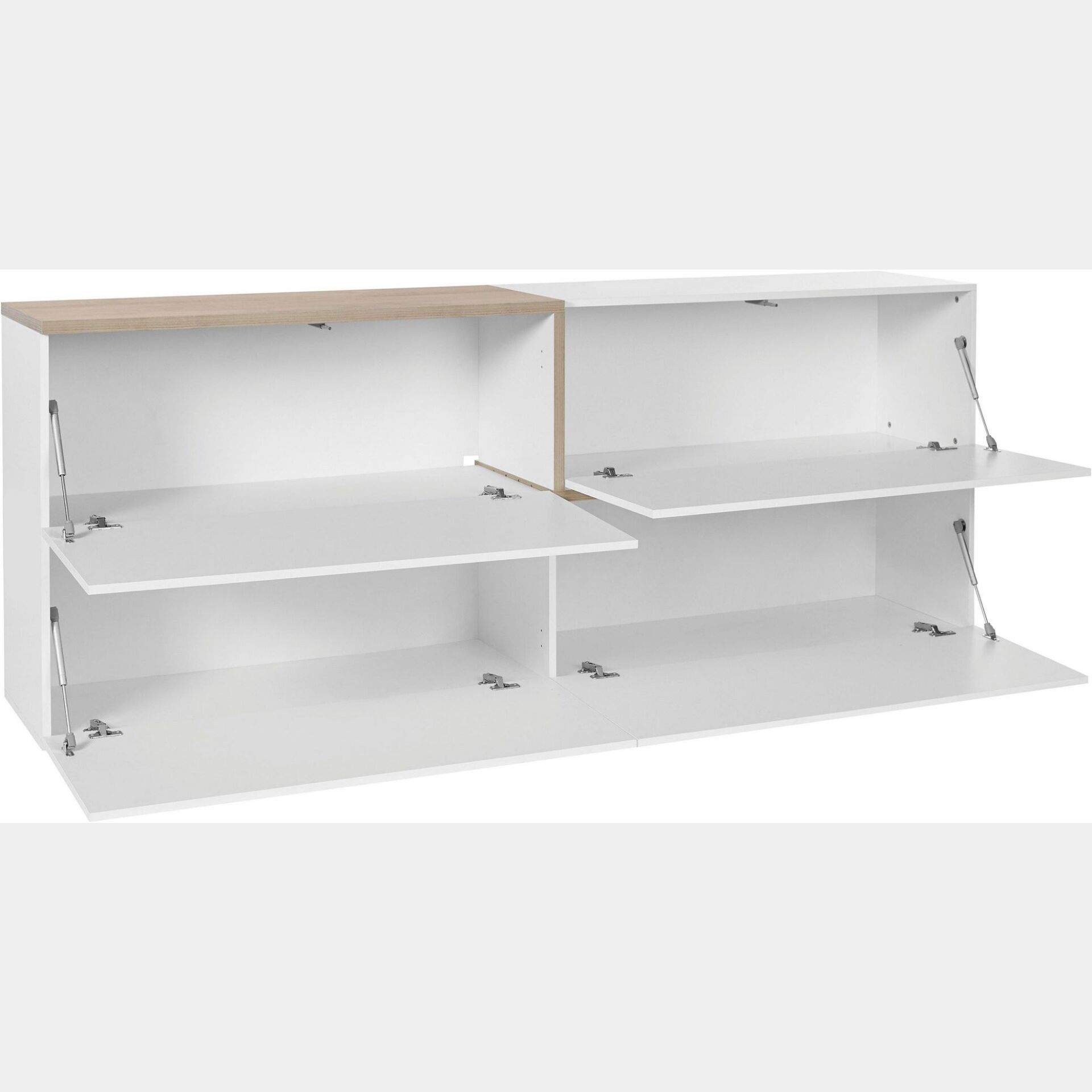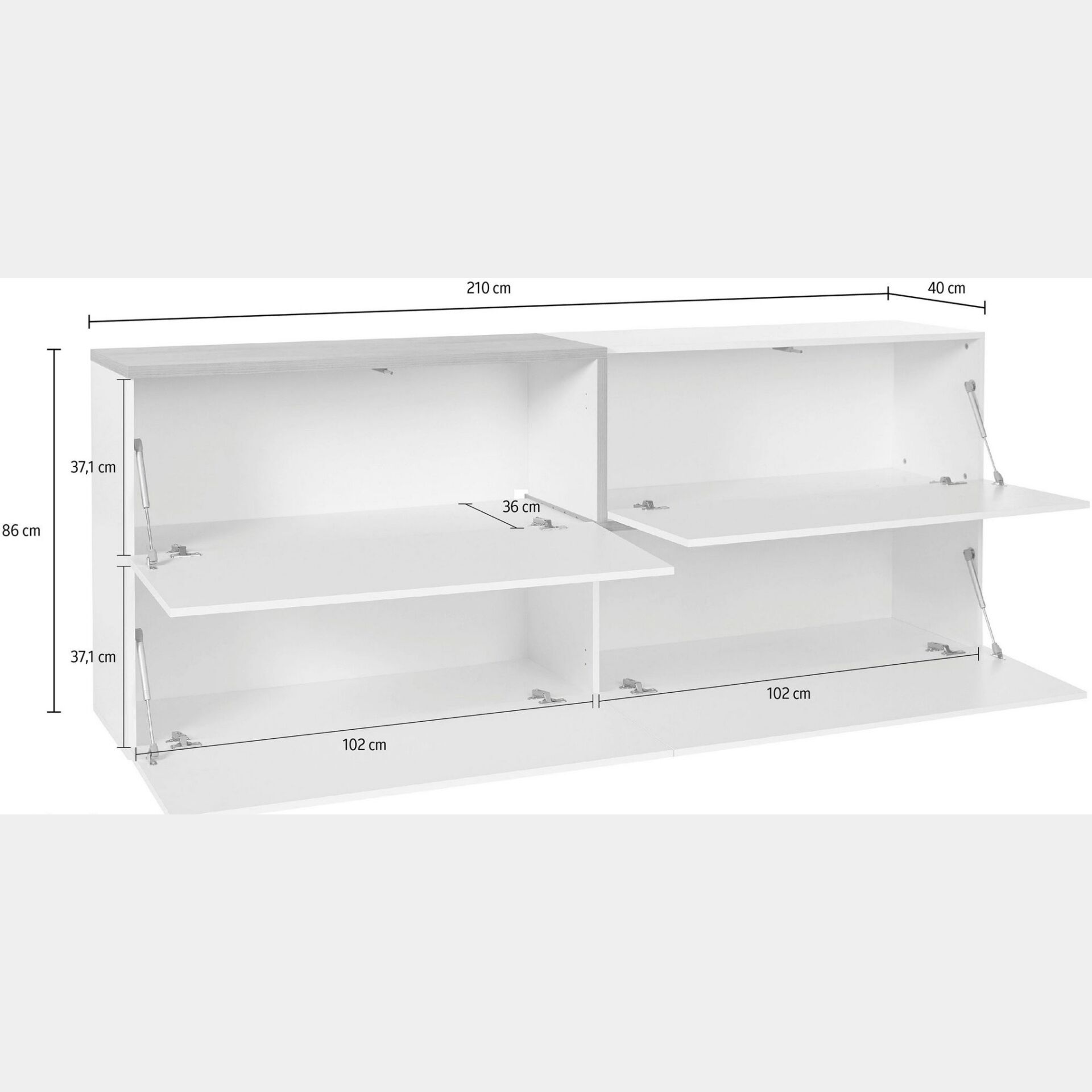 La madia presenta 4 ribalte, dotate di un pistone ciascuna per rallentare l'apertura. I 4 vani hanno una dimensione utile di 102x37.1 cm, questo permette alla madia di essere funzionale e capiente.