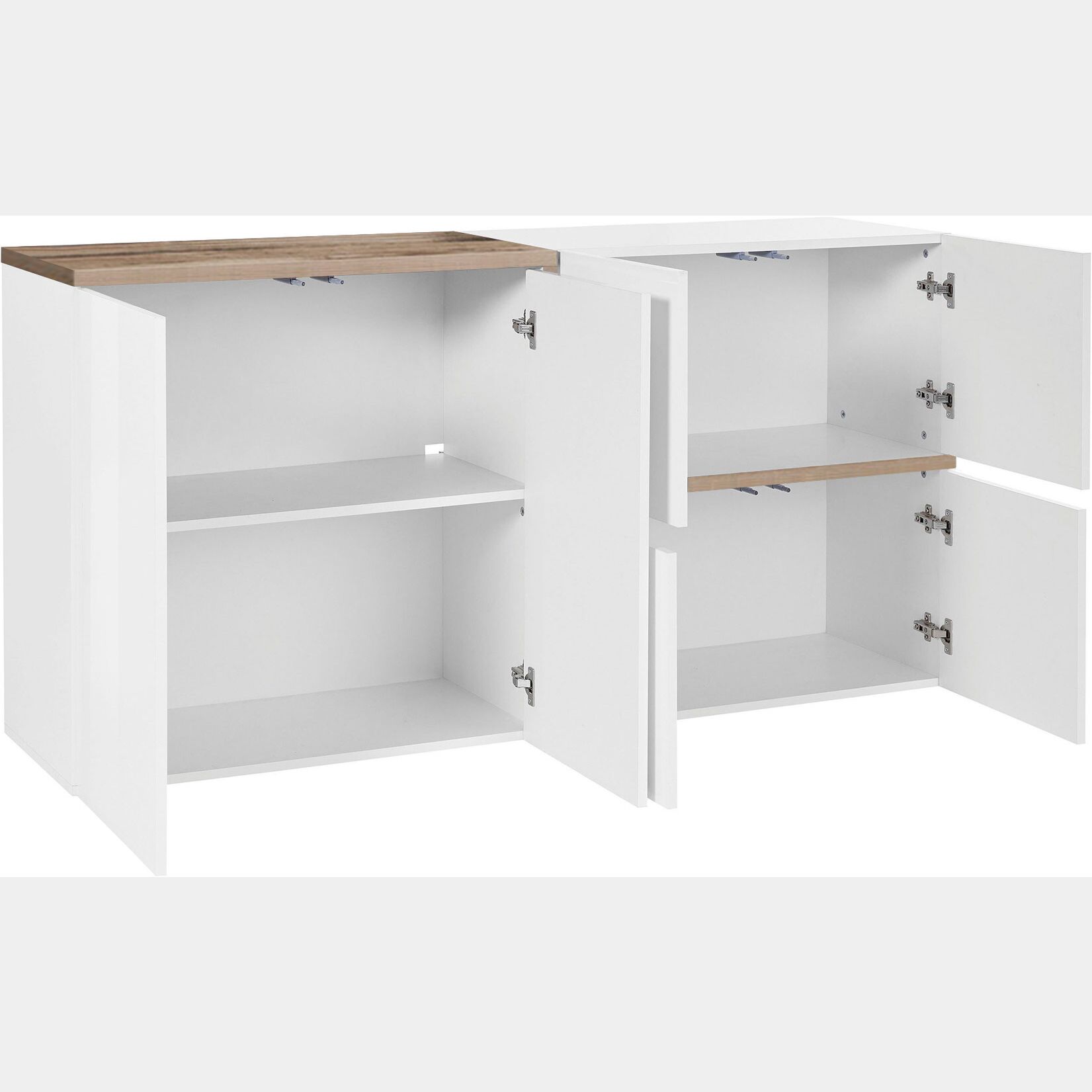 La finitura Bianco lucido viene contrastata da una tinta legno, il Pero, che crea movimento assicurando alla credenza una linea caratteristica e di impatto.