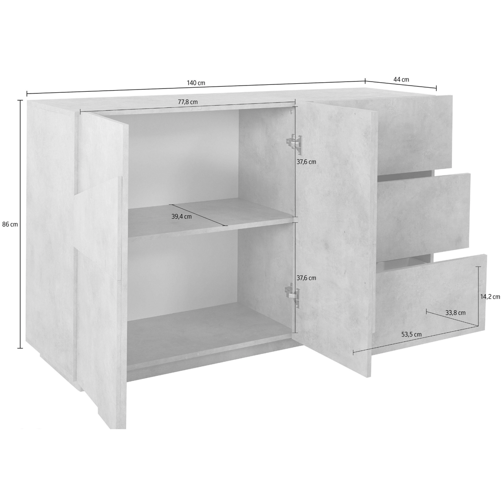 Madia moderna con 3 cassetti e 2 ante con disegno geometrico in Beton Madia moderna con 3 cassetti e 2 ante con disegno geometrico in Beton