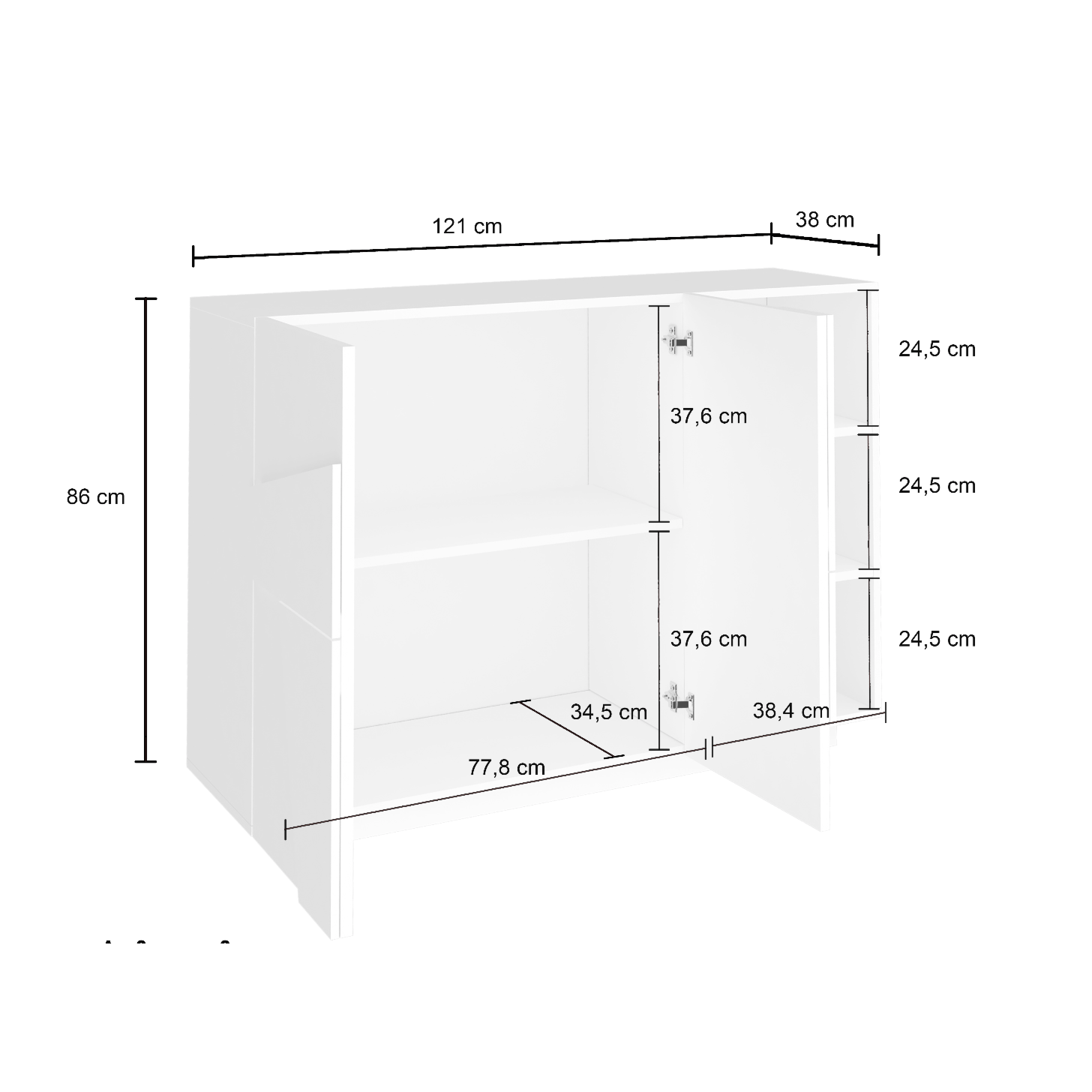 La dimensione del vano creato dal ripiano è di 37.6 cm. Della stessa collezione fanno parte altre madie di varie dimensioni e porta tv. Le fintiure disponibili sono bianco lucido, beton e ardesia.