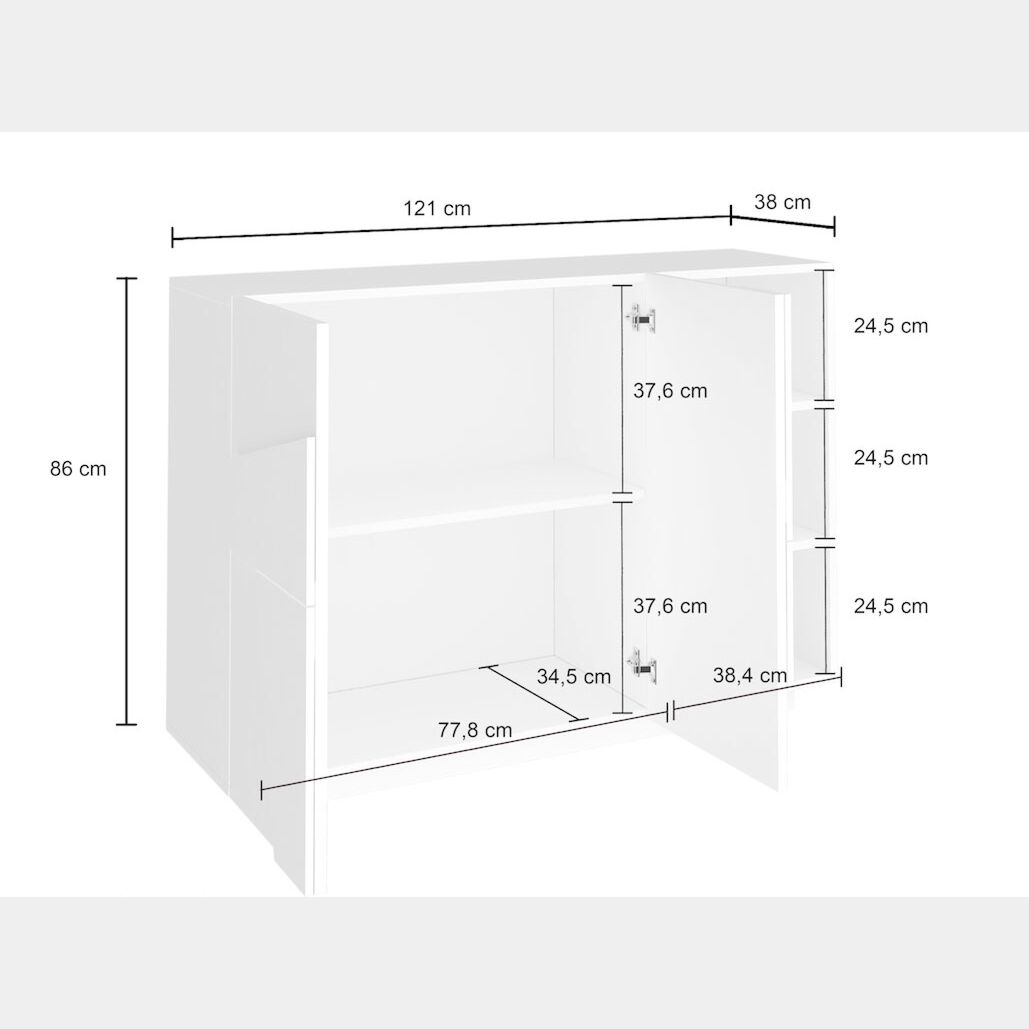 La dimensione del vano creato dal ripiano è di 37.6 cm. Della stessa collezione fanno parte altre madie di varie dimensioni e porta tv. Le fintiure disponibili sono bianco lucido, beton e ardesia.