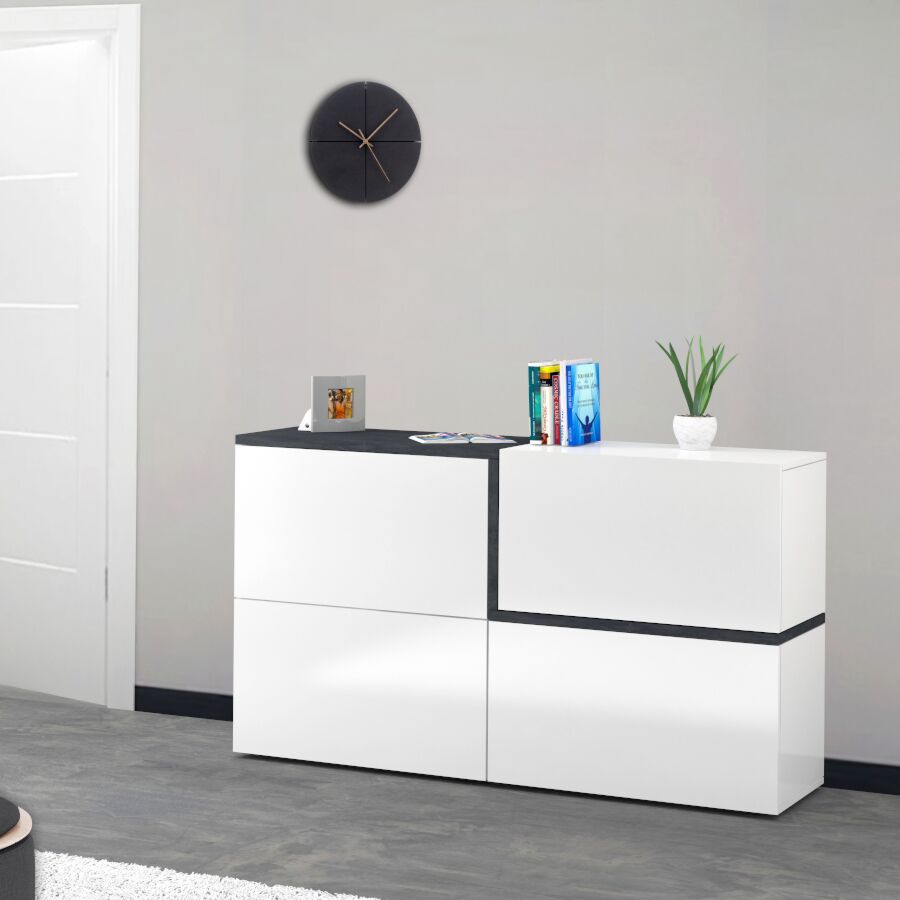 La madia moderna, che fa parte della collezione Zorro, è composta da 4 ante ribalta, finitura bianco lucido e ardesia.
