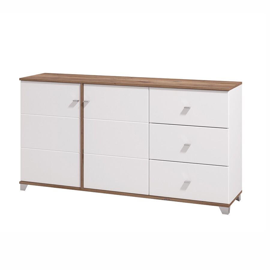 Madia moderna con cassetti e ante, finitura Bianco lucido e Quercia